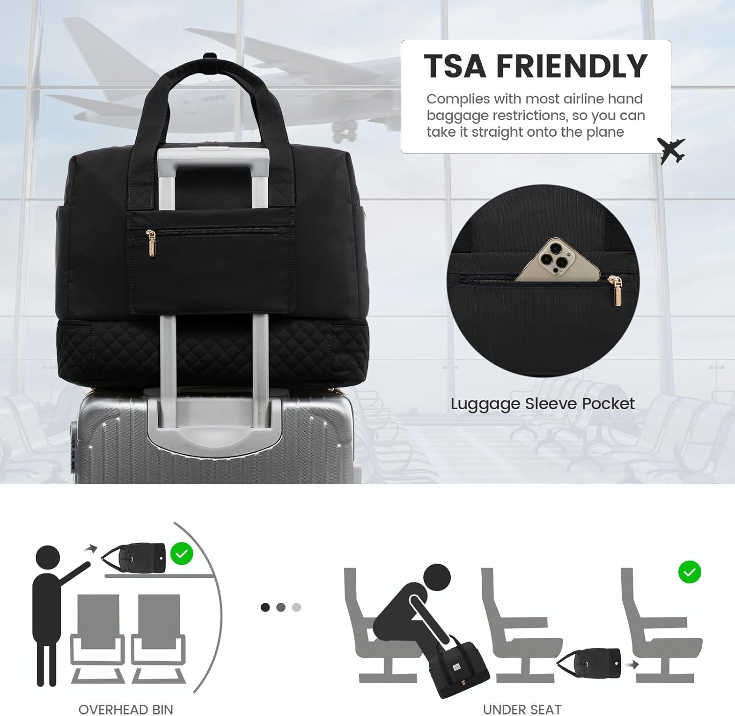 ✈️【Carry on Bags for Airplanes】With an 18*14*8 inches size, this travel duffel bag meets the standard of personal item bags of airlines. It can be put on the luggage set and under the seat easily. The luggage strap on the back of the bag allows it to be stably attached to a suitcase.