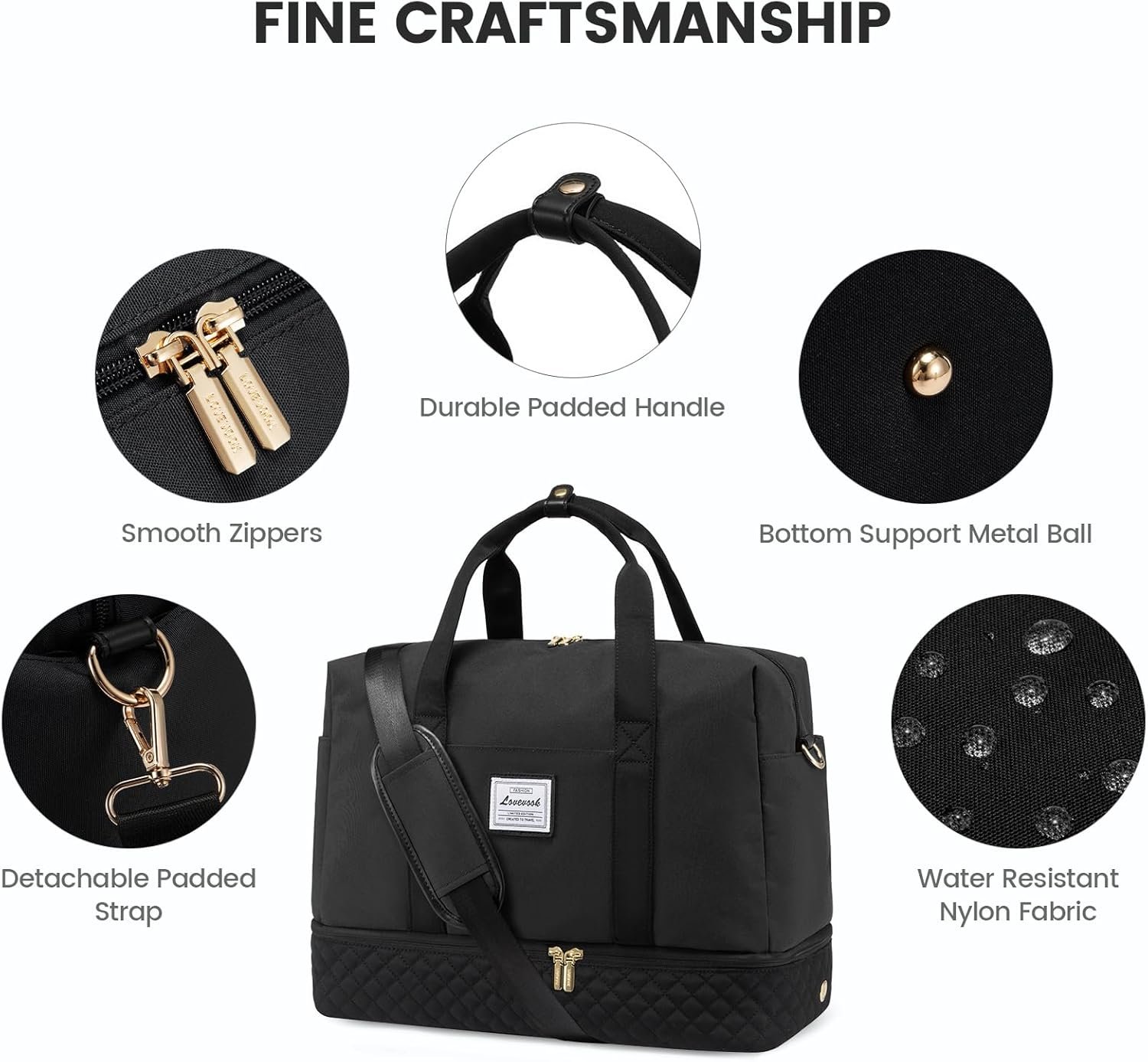 👟【Shoe Compartment & Detached Toiletries Bag】This weekender bag has one large main compartment and multiple pockets inside, which enable you to keep your things in order. Your toiletries and underwear can be placed in separate packing cubes. There are also two side pockets for bottles and umbrellas. A separate dry and wet compartment allows you to store wet towels and toiletries.