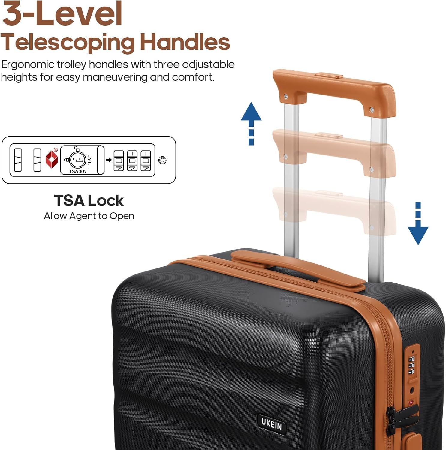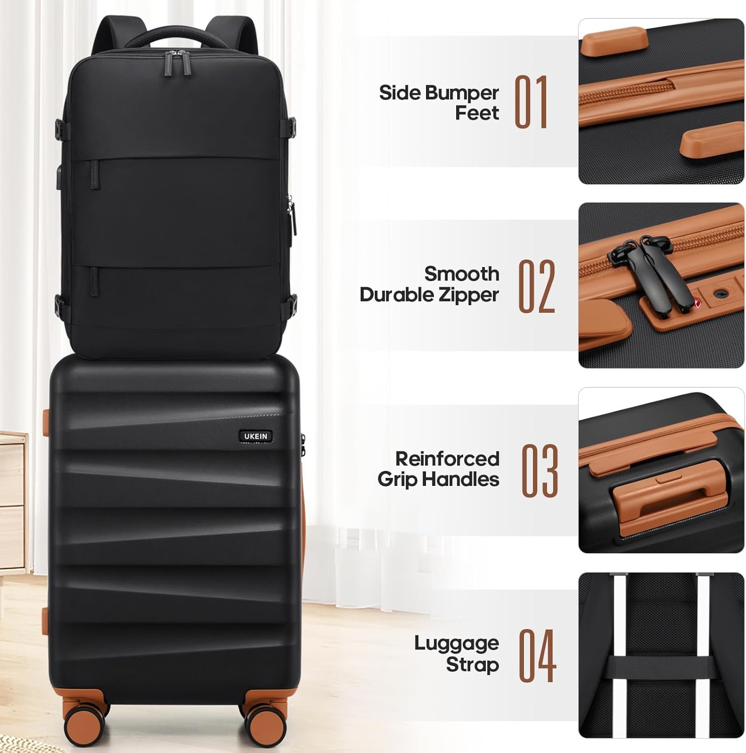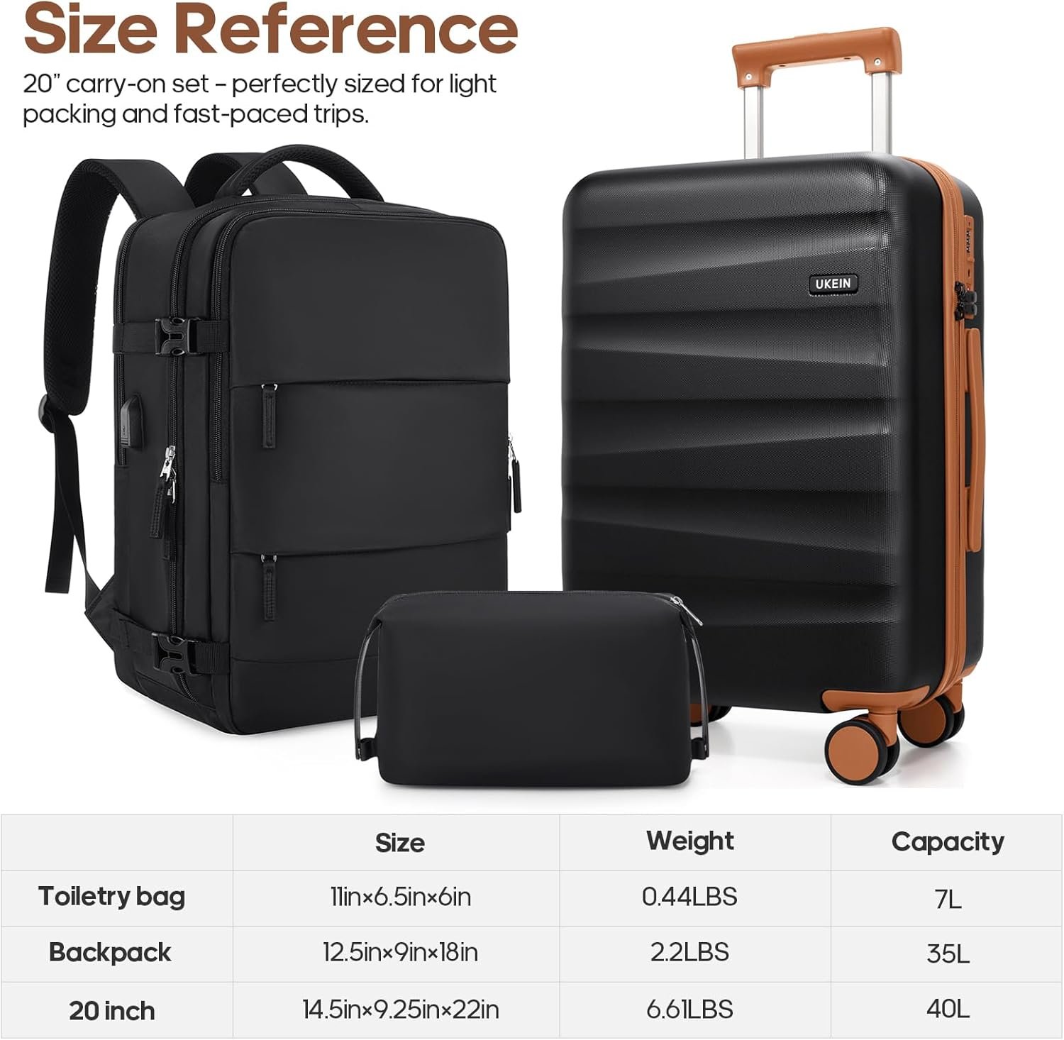 Luggage with Backpack Set : The UKEIN 20-inch carry-on luggage is designed to fit comfortably in overhead bins on almost any flight. Paired with a matching backpack for carrying your in-flight essentials, while the large toiletry bag helps you stay organized with all your travel necessities. Ideal for both business and leisure trips, this suitcase set offers a practical and stylish solution for any traveler.