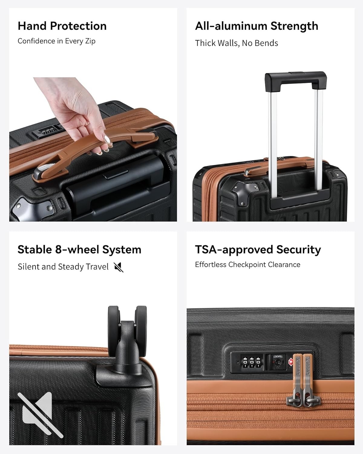 Robust Aluminum Protection – This hard shell suitcases with wheels features 4 corner protectors made from all aluminum, providing extra protection against damage during travel. Enjoy a longer accompany period even in violent transportation.