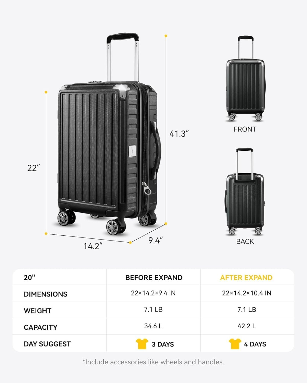 Size: 22×14.2×9.4 IN, Weight: 7.1 LB, Capacity: 34.6 L (Including spinner wheels, handle, accessories, etc.)