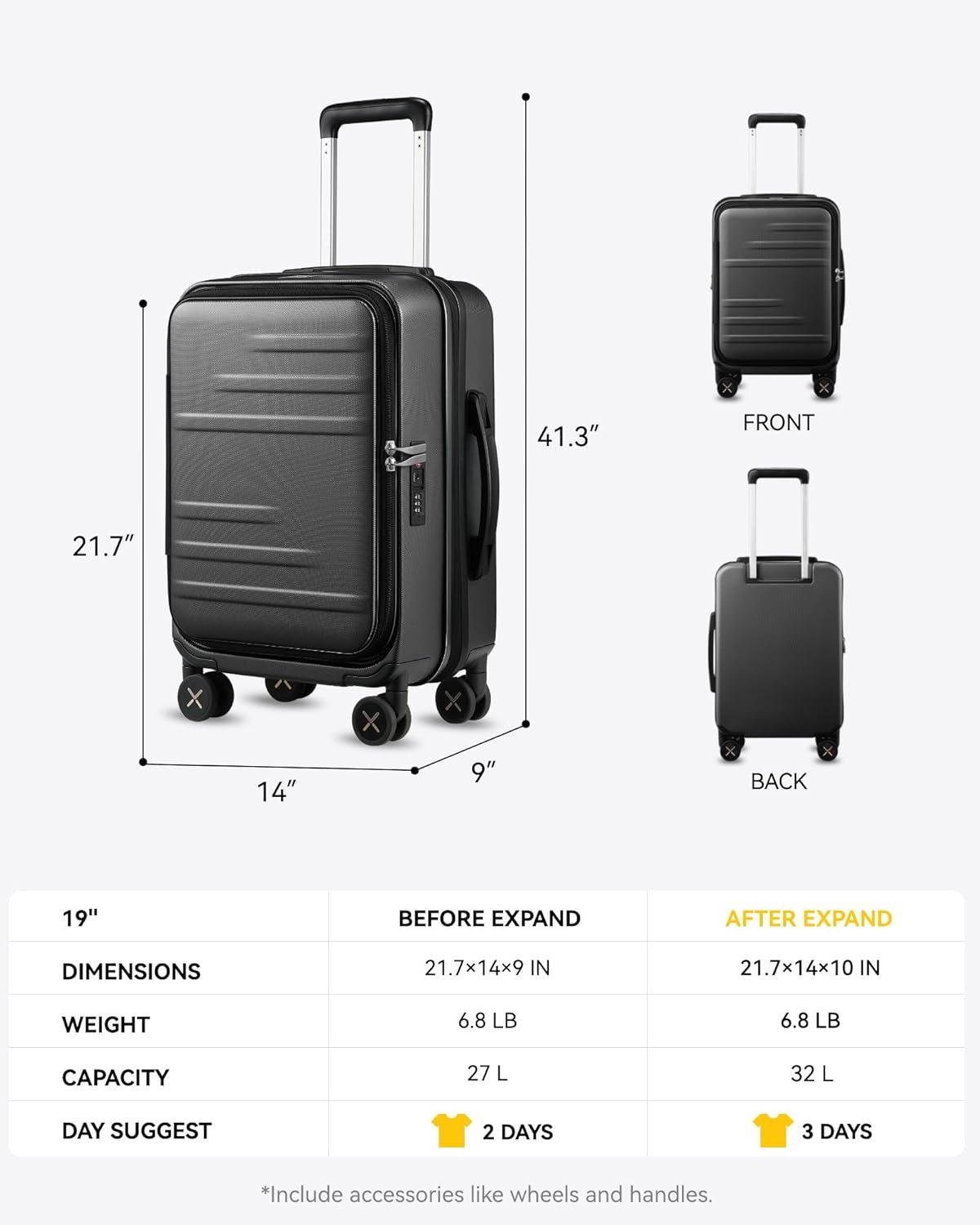 Front Opening Design: This suitcases with wheels features a front opening, saving space and making access to your belongings a breeze. Effortlessly open and close your suitcase like never before!