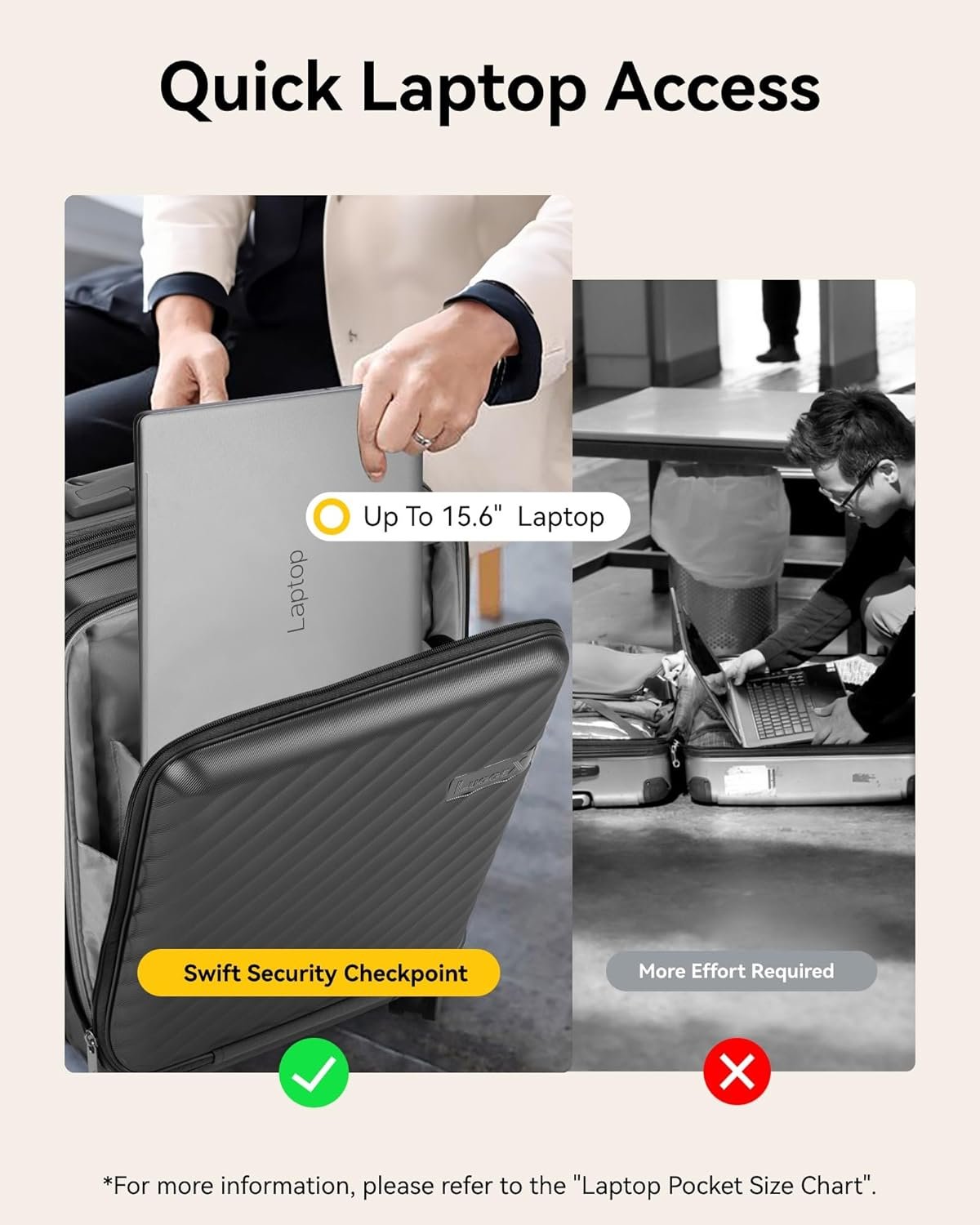 Front Pocket Convenience: The expandable carry on luggage with laptop compartment helps you enjoy quick and easy access to your essentials. Hard case luggage features a spacious front pocket and accommodates laptops up to 15.6 inches, providing a secure and easily accessible compartment for a seamless travel experience.