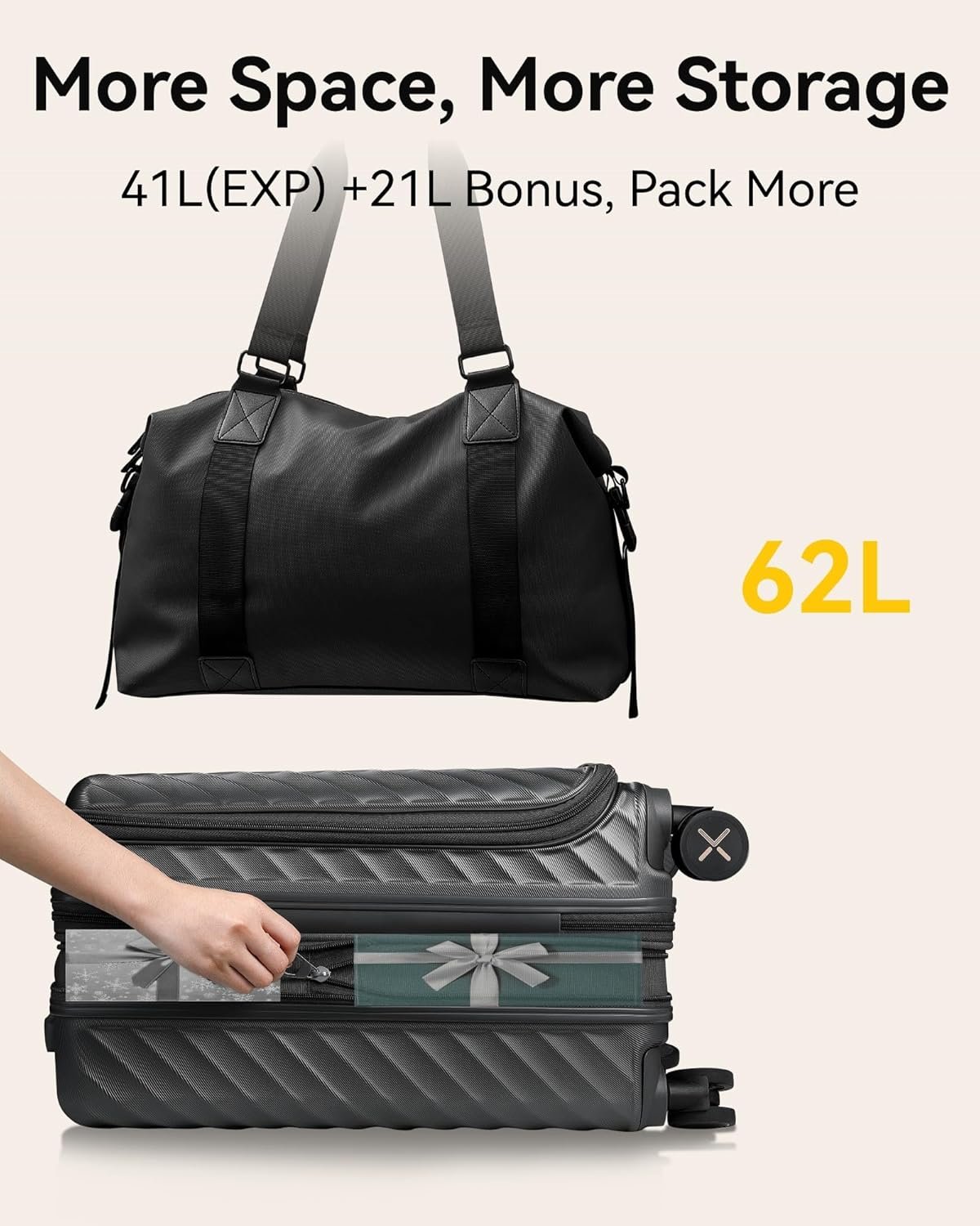 Maximize Packing Capacity: LuggeX luggage 20 inch carry on set offers an additional 15% expandable capacity and comes with a carry on duffel bag. Our carry on and tote set making it ideal for those who require ample storage space. Pack efficiently and accommodate your essentials with ease.