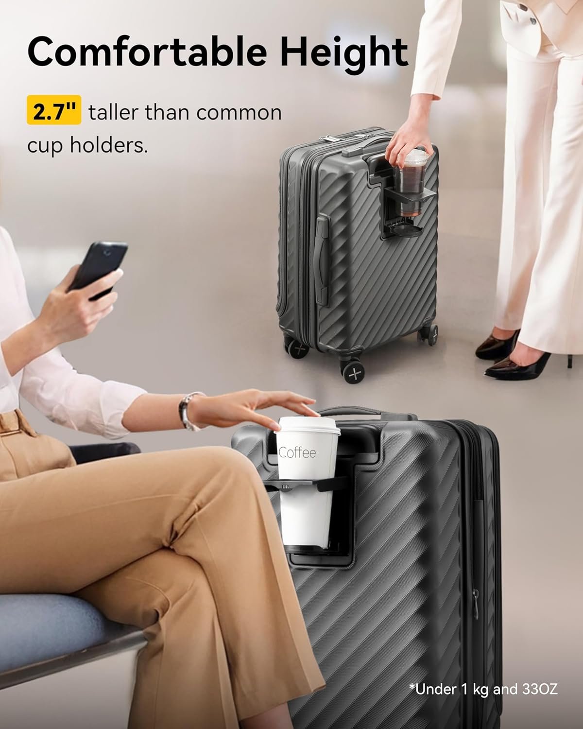 Hydration On-The-Go: Our hard suitcases with wheels equipped with an integrated water bottle holder. Expandable luggage with cup holder ensures you stay hydrated throughout your journey. Experience the convenience of a built-in cup holder designed for easy access, adding a refreshing touch to your travels.