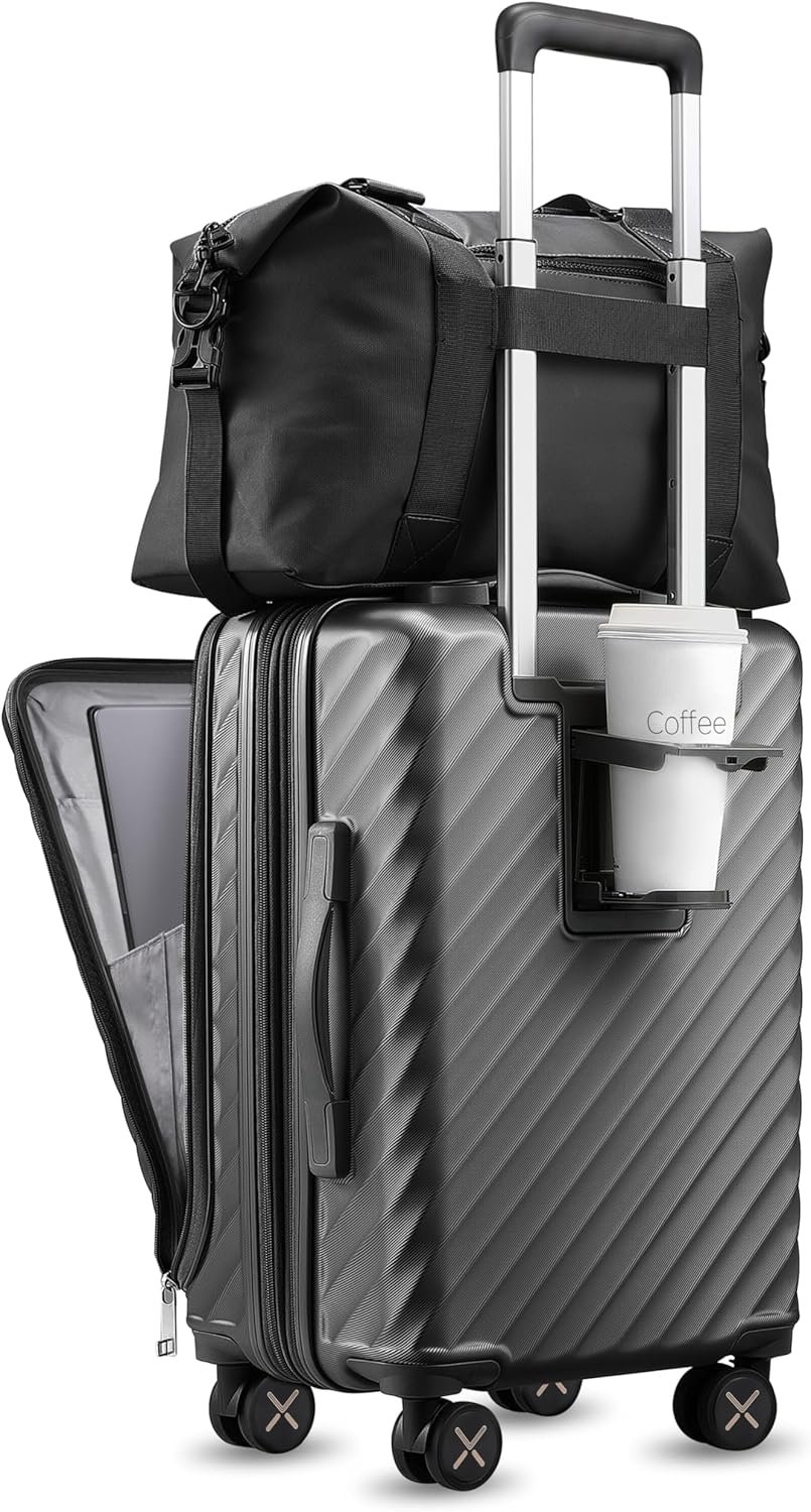 LUGGEX Carry On Luggage with Laptop Compartment and Cup Holder, Expandable PC Hard Shell Suitcase with Front Pocket (Gunmetal, 2-Piece Set (20/Tote))