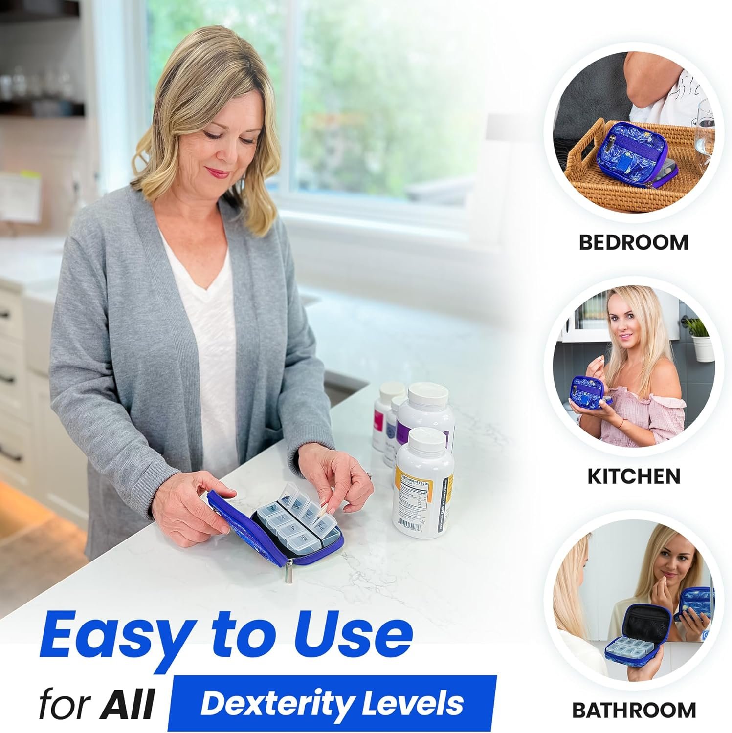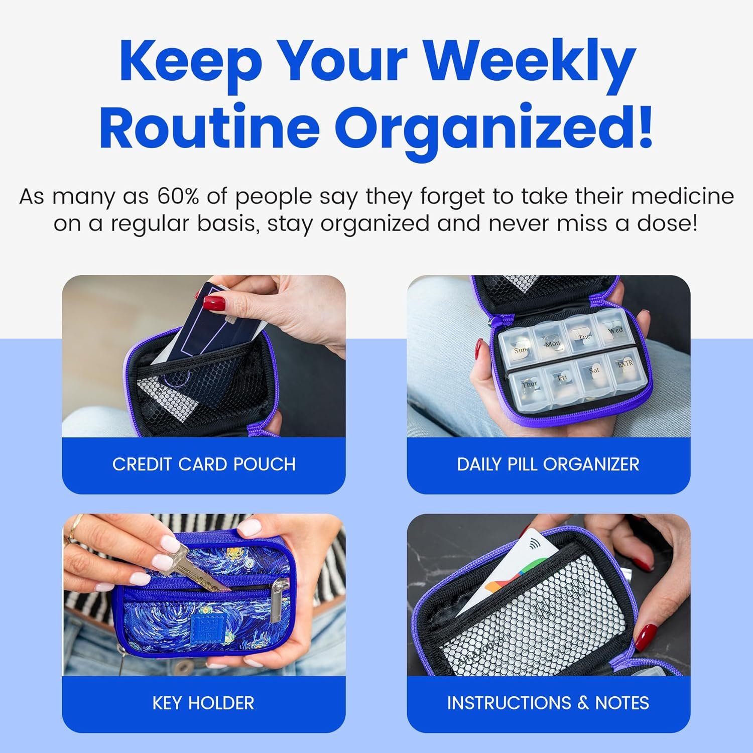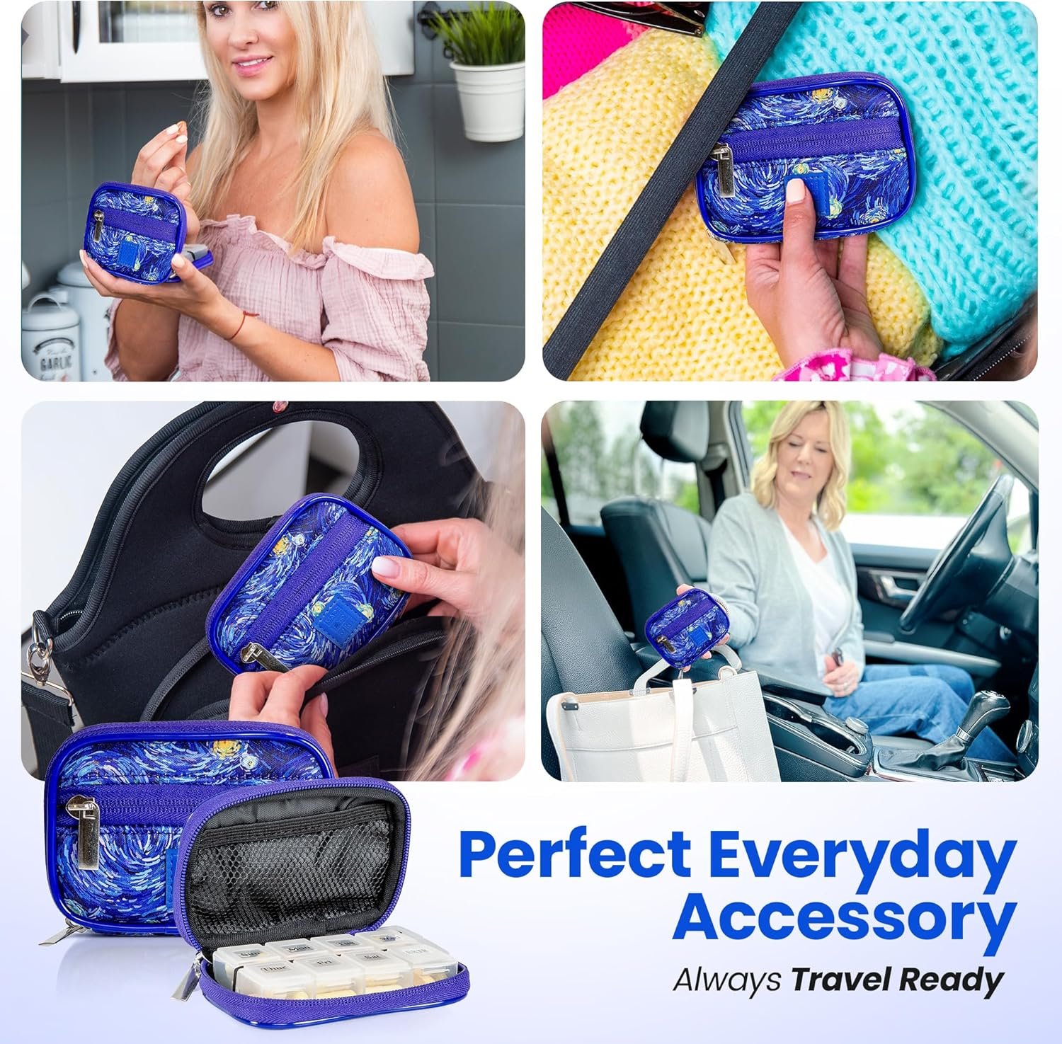 Made Easy Kit Pill Case – Weekly Medicine Organizer with Removable Seven-Day Vitamin & Supplement Box – Premium Neoprene for Travel Purse Accessory (Blue Starry Night)