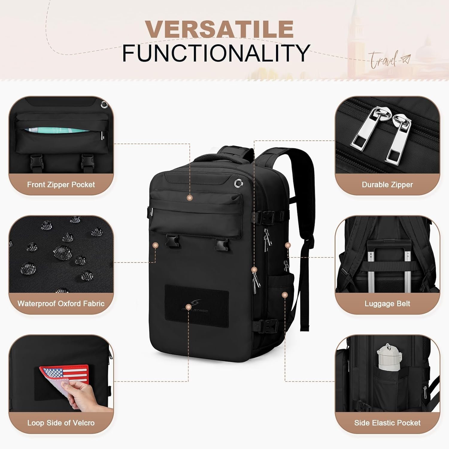 Convenient Travel Features: Enjoy hands-free transportation with the luggage belt that securely attaches the backpack to your carry-on luggage. This lightweight carry on backpack is designed for easy travel and also includes a back anti-theft pocket to keep your valuables safe and secure.The elasticated side pocket of this versatile backpack securely holds water bottles, umbrellas, and other travel essentials.