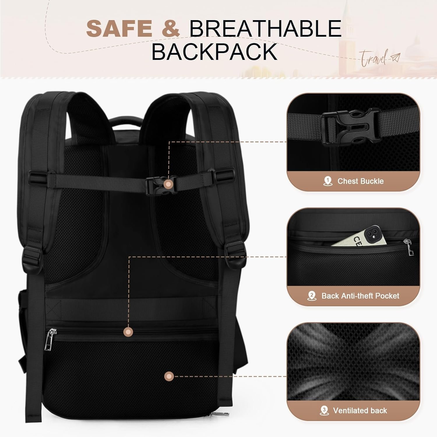 Enhanced Device Protection: Safeguard your laptop or iPad during travel with the padded compartment in this laptop backpack. It provides reliable protection against bumps and scratches, ensuring the safety of your devices.