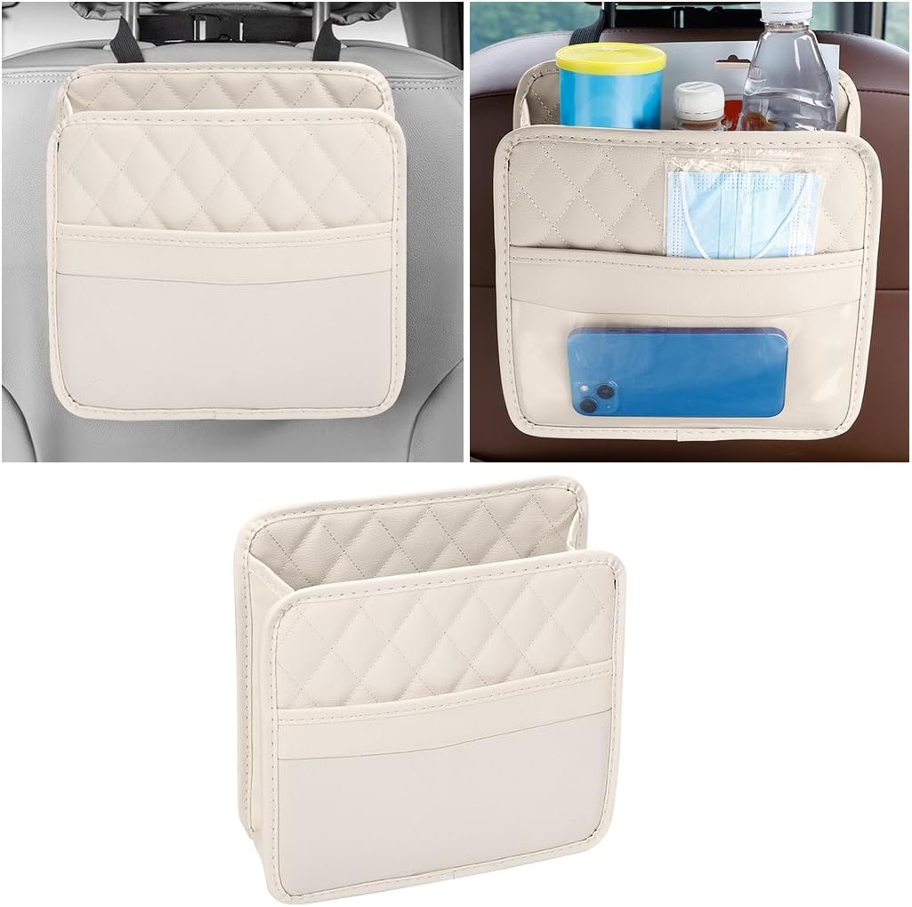 Mandark Car Seat Back Organizer, PU Leather Vehicle Backseat Hanging Storage Pocket, Multipurpose Automotive Travel Essentials Accessories for Kids & Adults, Universal for Most Cars(Beige)