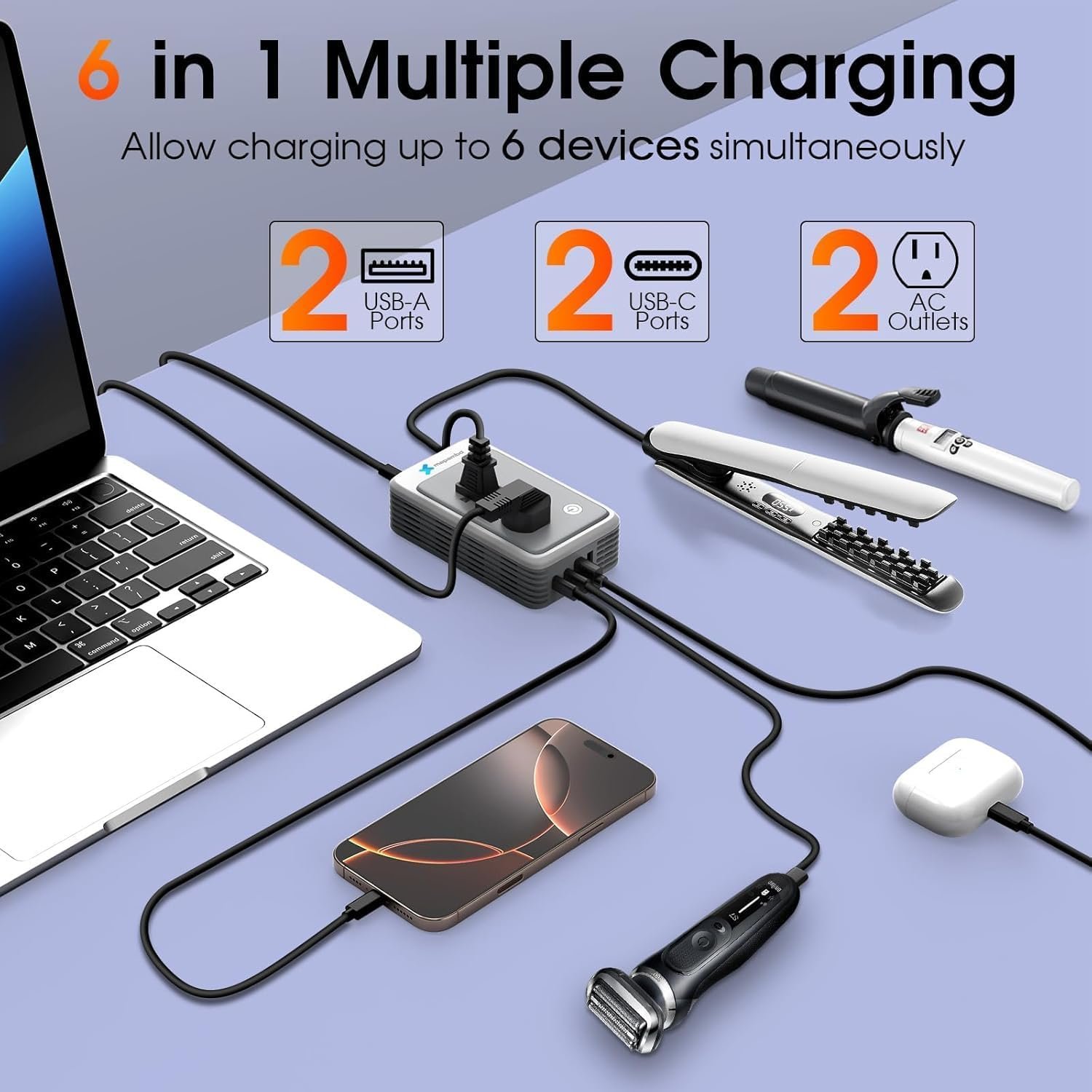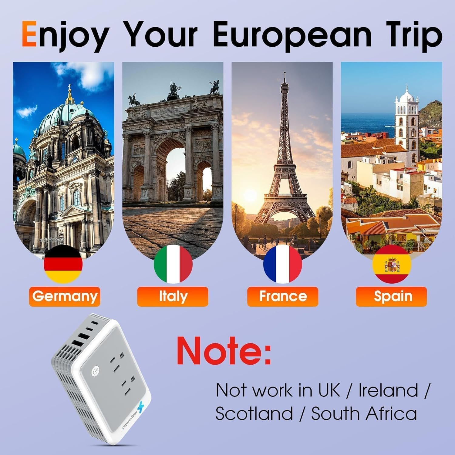6-in-1 Power Converter for Europe: The International Europe travel converter includes 2*AC outlets, 2*USB-A ports and 2*USB-C ports, can charge up to 6 devices at a time. The portable voltage converter making it perfect for both short and long trips