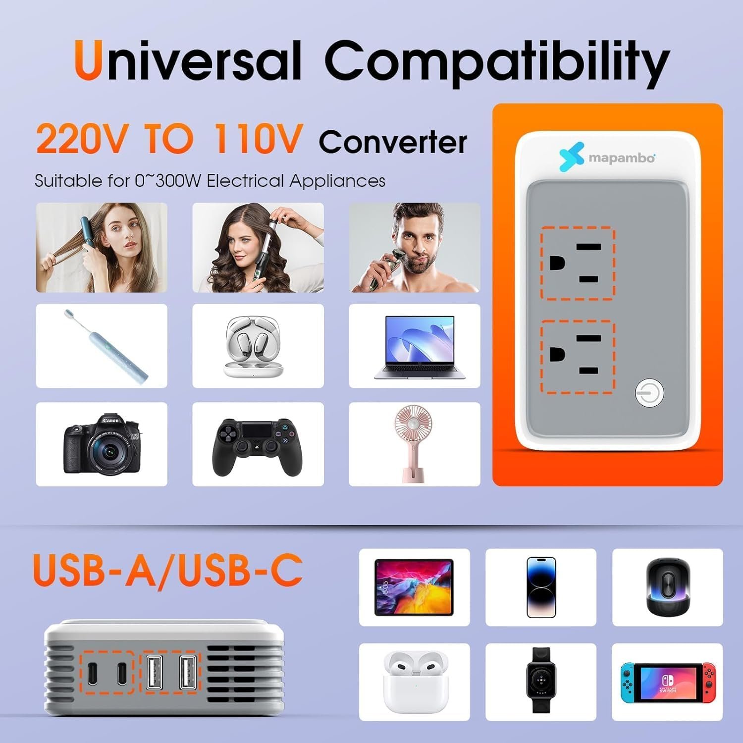 300W Enhanced Power Capacity: The advanced step down converter supports devices from 0 to 300 watts, suitable for most low to medium-power appliances. (Note: It is not intended for high-power devices above 300W such as hair dryers or electric iron)
