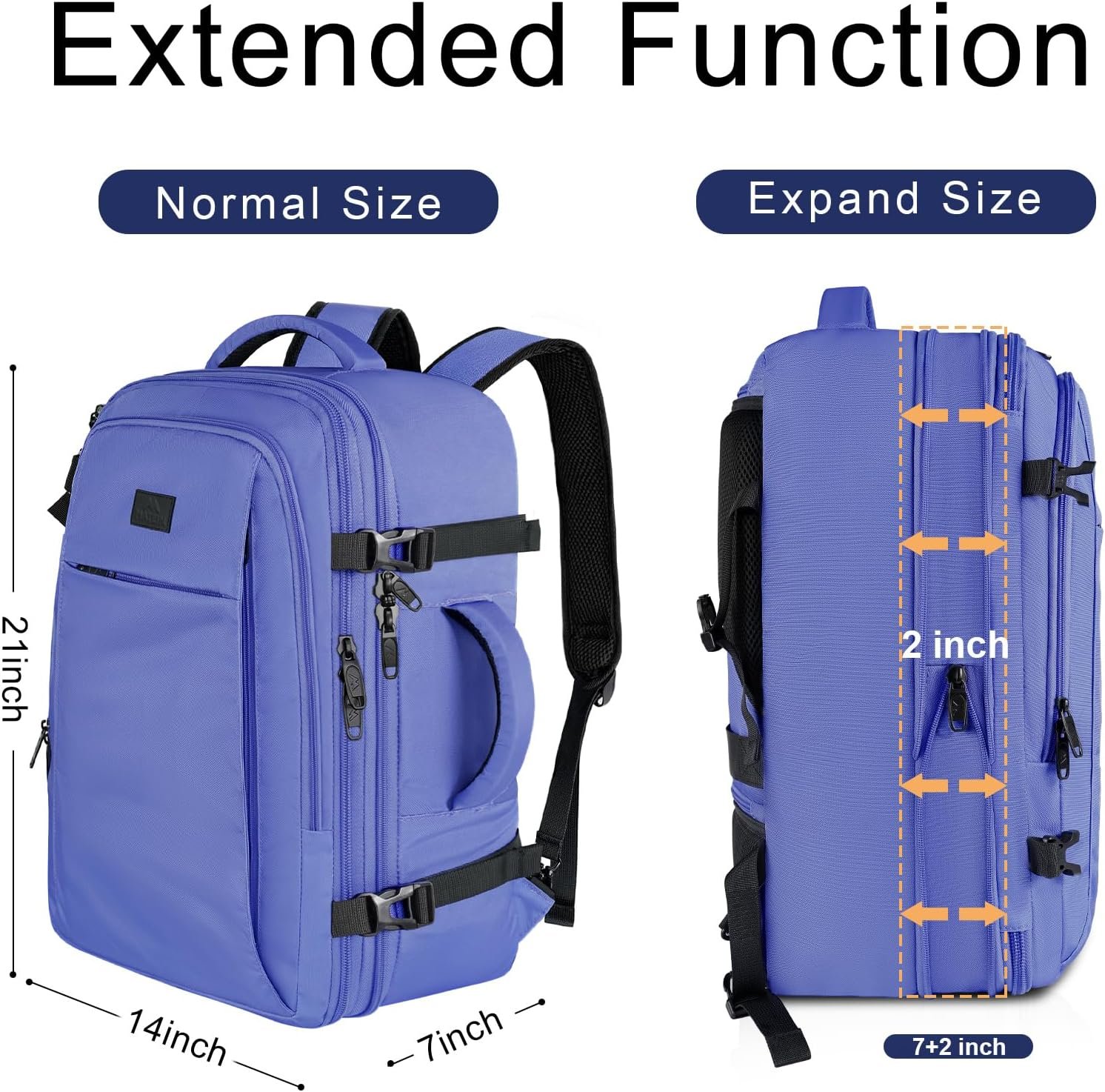Expandable & Large Capacity: Normal size: 21*14*7 inch, After expanding: 21*14*9 inch, Light Weight 1.08Kg(2.38lb). The extra large travel backpack with expandable feature offers you capacity up to 50L. Unzipping to get larger storage space, can hold 3-6 days travel gear. The TSA approved carry on backpack comes with 180° zipper closure helps you go through the security check quickly. The luggage backpack for travel meets most airline carry-on requirement also fits in the overhead compartment