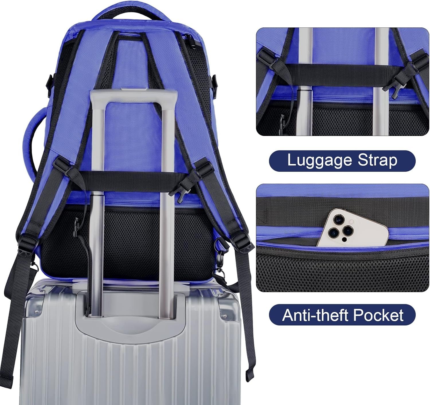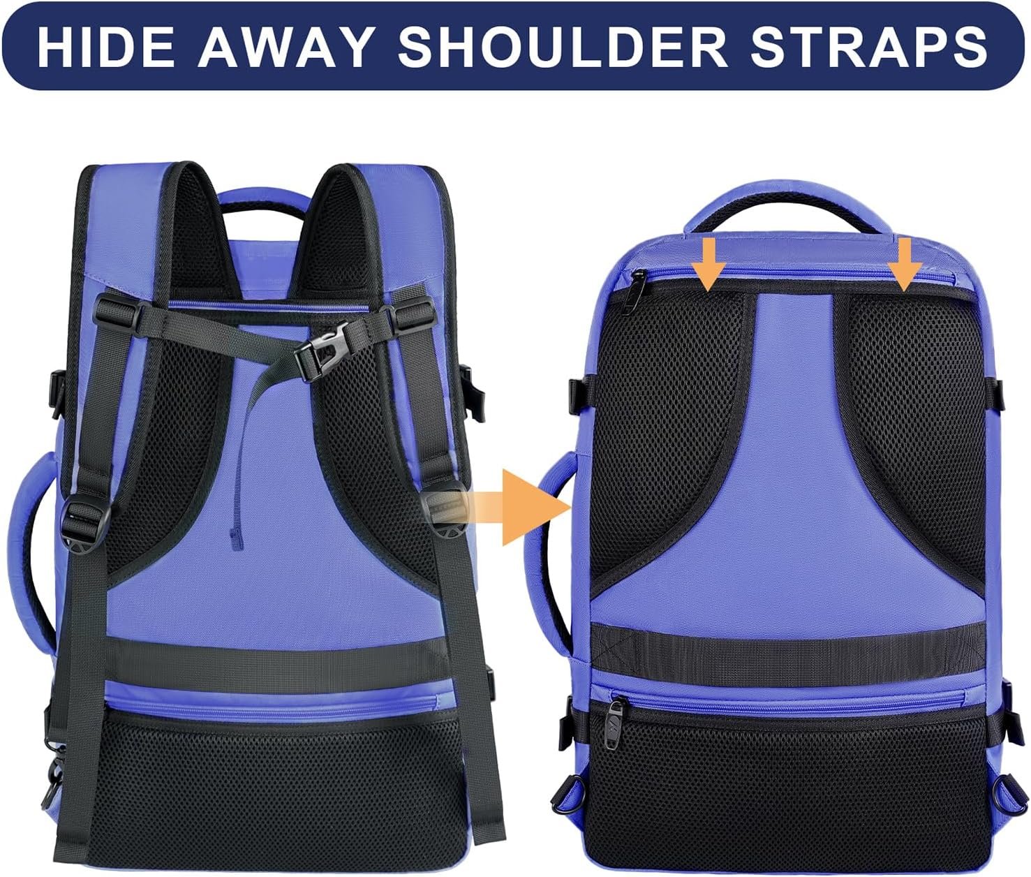 Built For Travel: This periwinkle carry on backpack for women is designed with hideaway padded shoulder straps which can be hidden away in the back zippered compartment, transforming carry on backpack into suitcase backpack. Two padded grab handles are set on the top and the side of the backpack for women travel bag, which allow an easy switch between backpack and suitcase. A luggage strap on the back is designed to fit on suitcase for easy carrying. It’s the gifts for travellers women