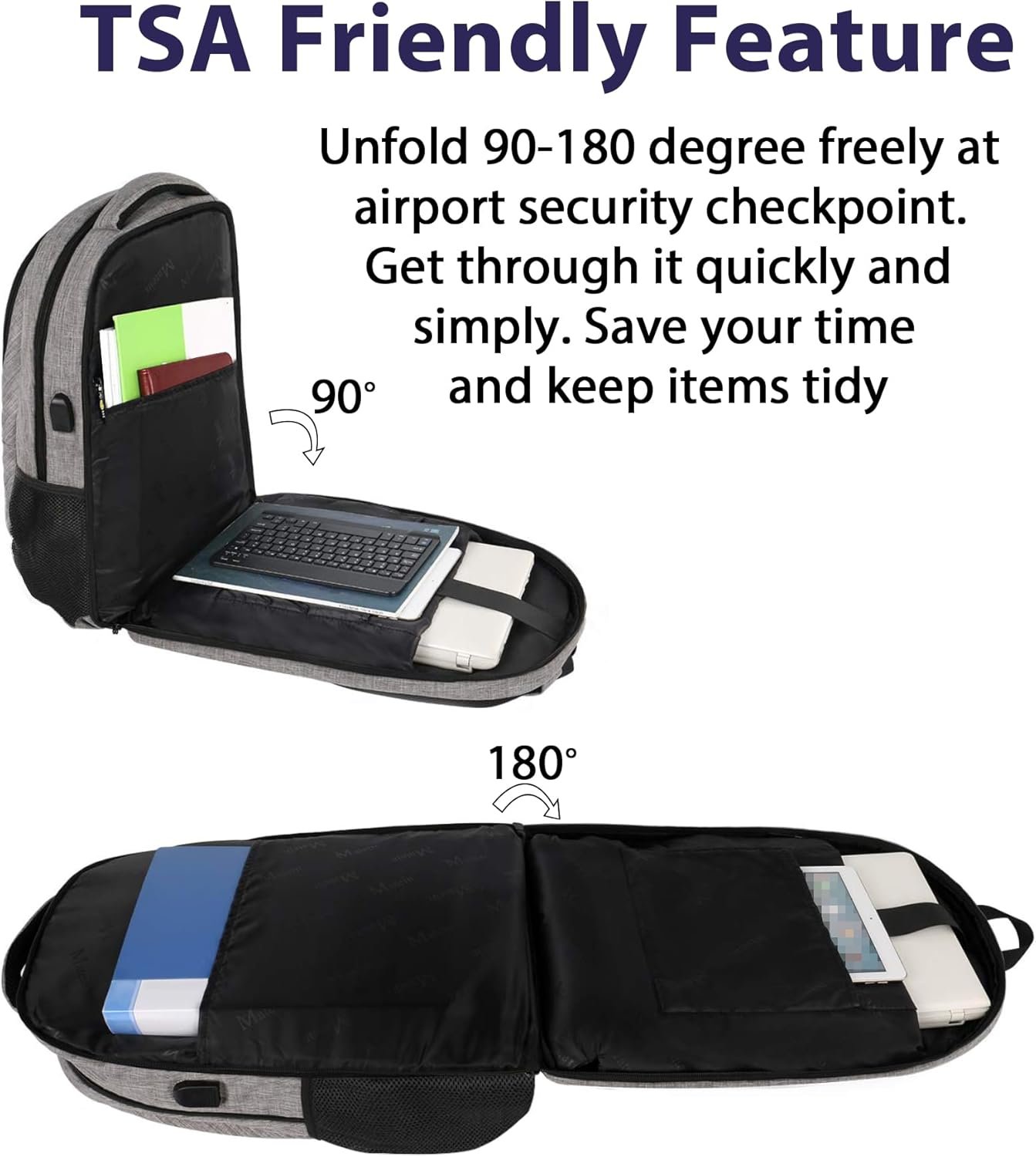 TSA Approved Backpack: TSA function is exclusively designed for airplane flight travel. At checkpoint, unfolds the laptop travel backpack freely 90 to 180 degrees and the laptop stays flat without taking it from the bag, making it getting through airport security checkpoint more easily. This 17 inch laptop backpack is large and lightweight enough for school, travel, hiking, vacation, weekend getaway, overnight trip