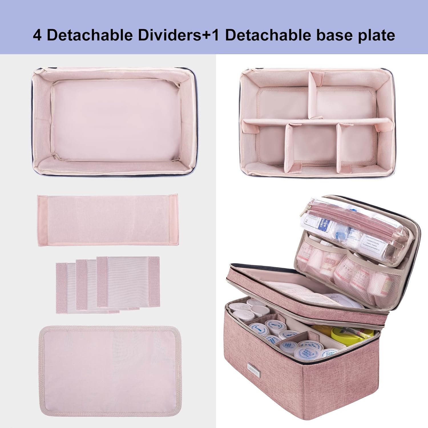 Double-layer room:The top compartment provides extra space, and also classify medicine bottles according to their different use. Meanwhile, this bag comes with a removable transparent pouch for precious supplies.