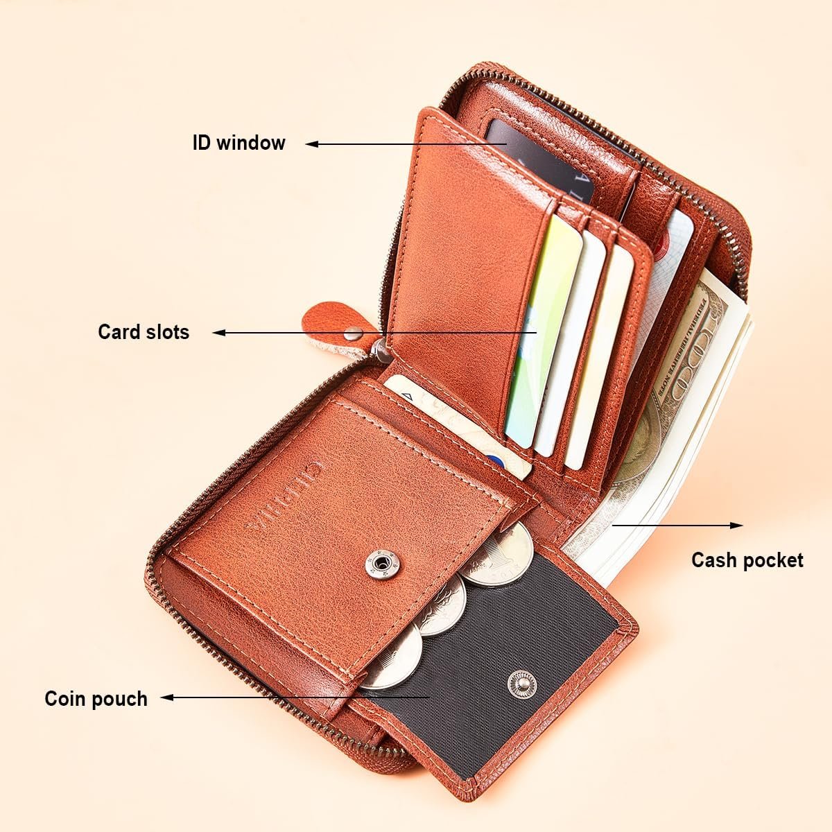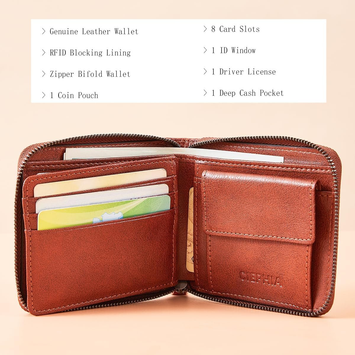 LARGE CAPACITY: It can not only accommodate 8 credit cards, but also hold 1 ID card, 1 driver’s license, 1 multi-purpose storage bag and a deep cash pocket. All cards can be placed in order, and banknotes, coins also have corresponding placement positions.