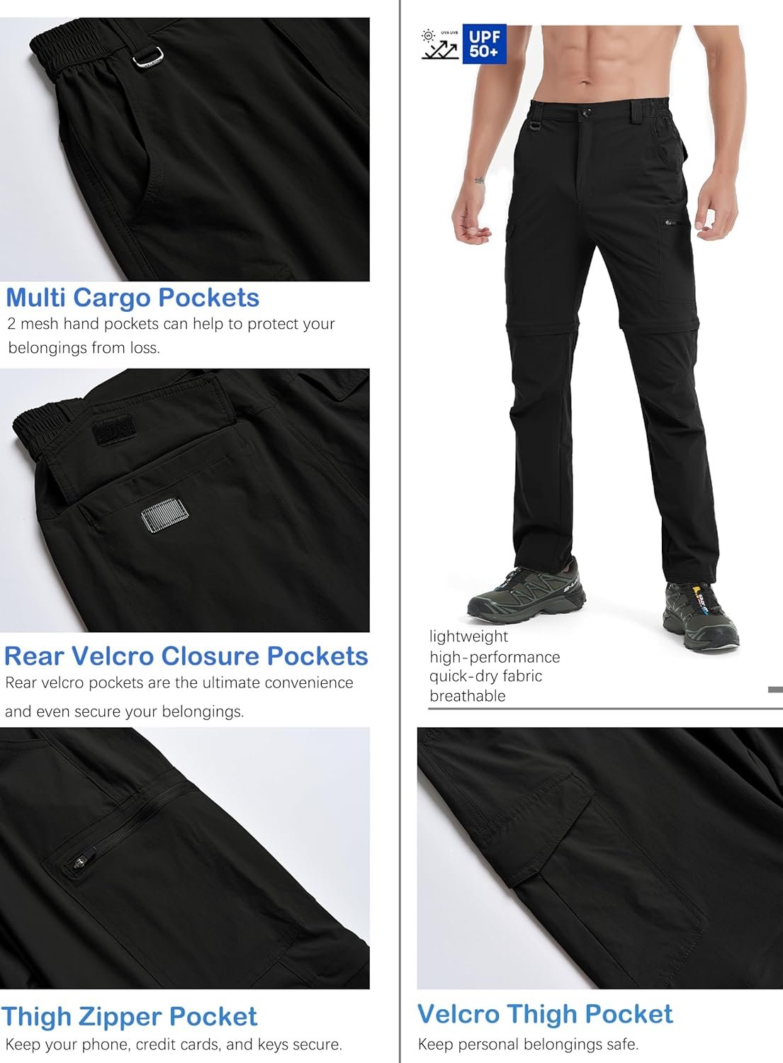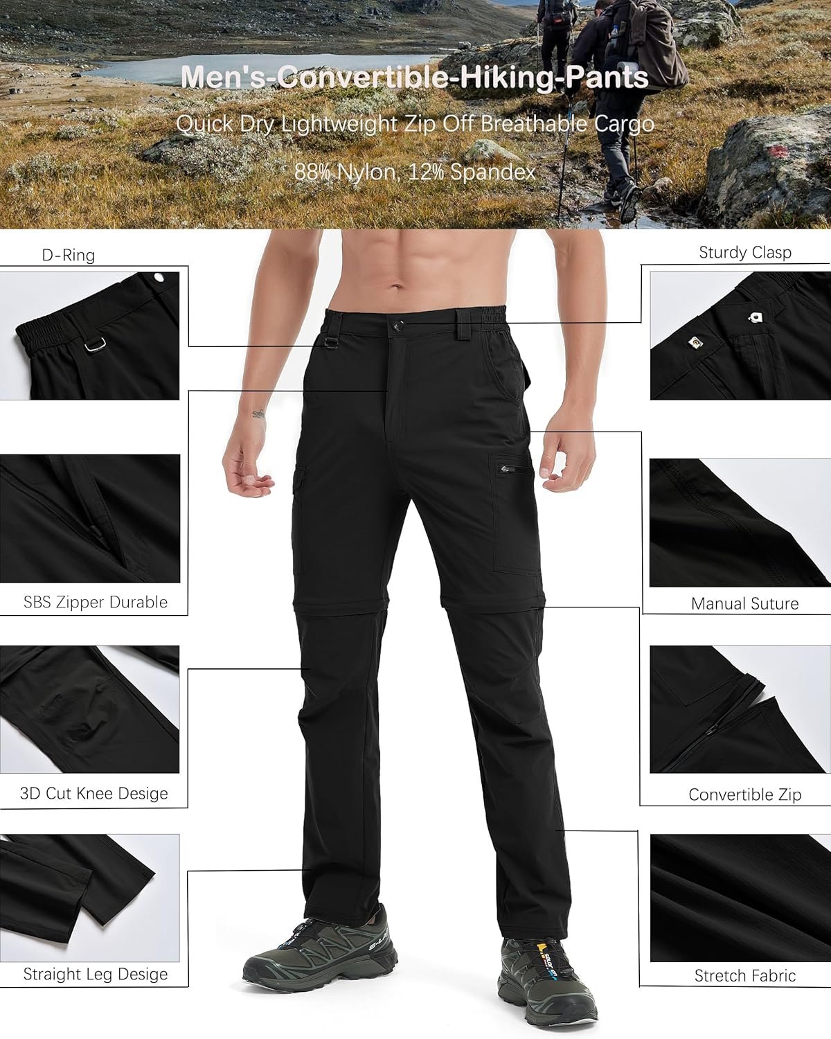 mens convertible pants are made of water-resistant, lightweight, breathable, quick dry, stretch, and high-performance fabric that adapts to hiking, fishing, camping, work, and travel
