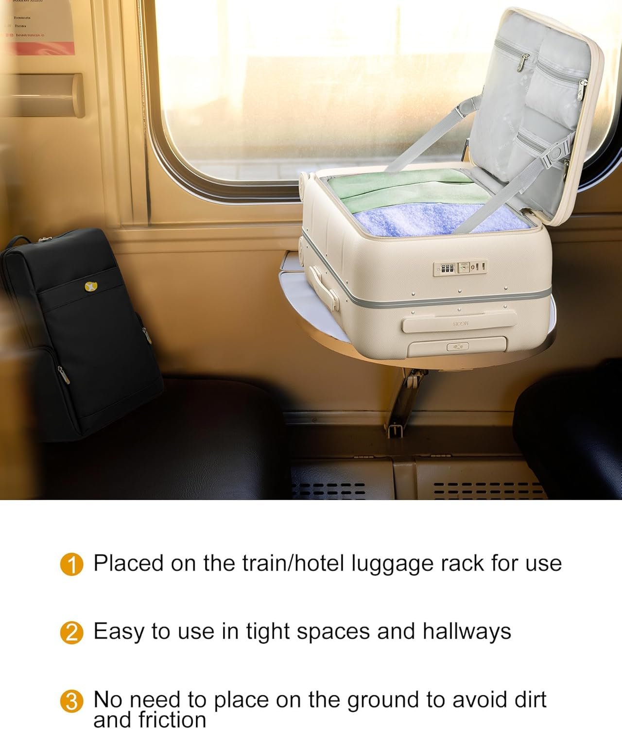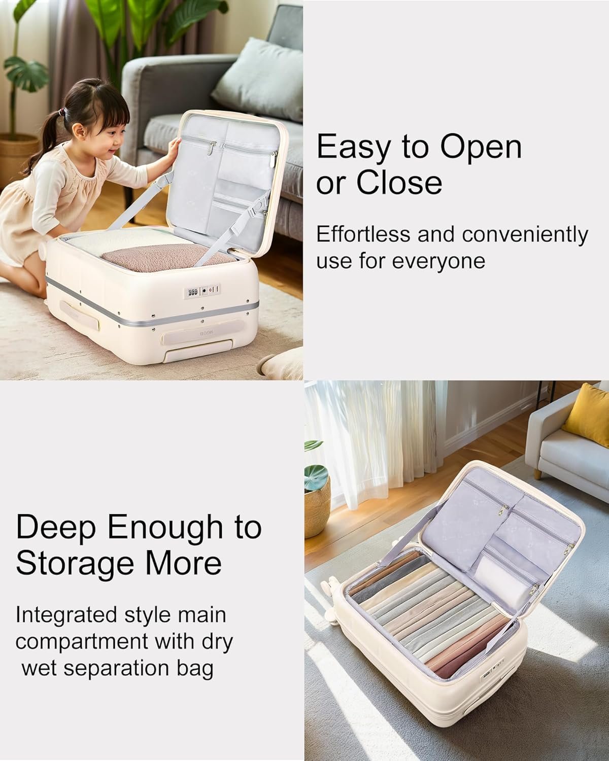 【CREATIVE FRONT OPENING】 Leading the future opening and closing method which is effortless to open or close the suitcase, not only is it easy to load, but it also saves space. This design solves the problem that traditional luggage separated 2 compartments of heavy load then it’s difficult to open and close. Importantly, it also avoid the displacement of items.