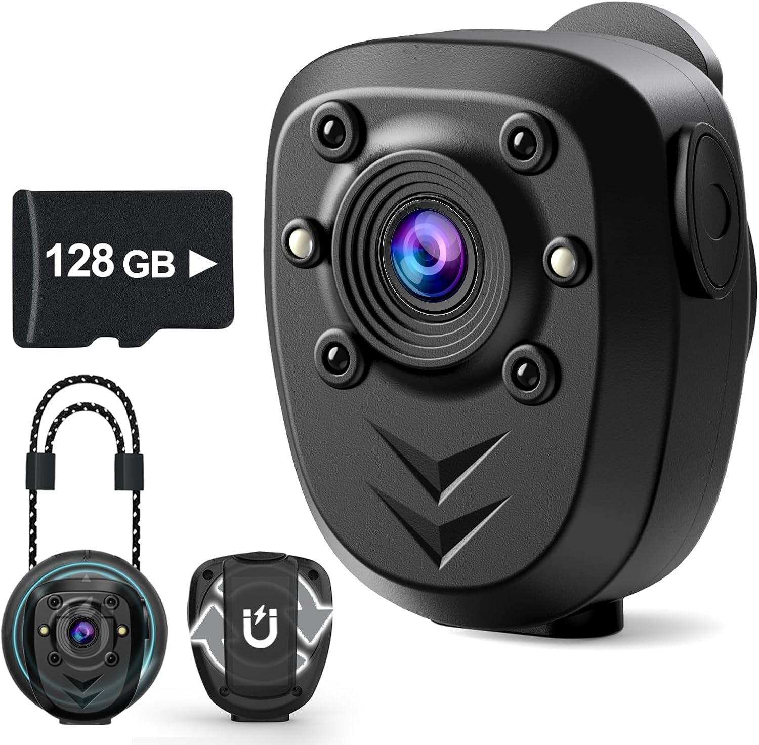 Mini Body Camera Video Recorder Built-in 128GB Card with Night Vision IR & Loop Record HD 1080P, 6 HR Battery Life Police Cam for Outdoor, Law Enforcement, Security Guard (128G With Magnetic Lanyard)