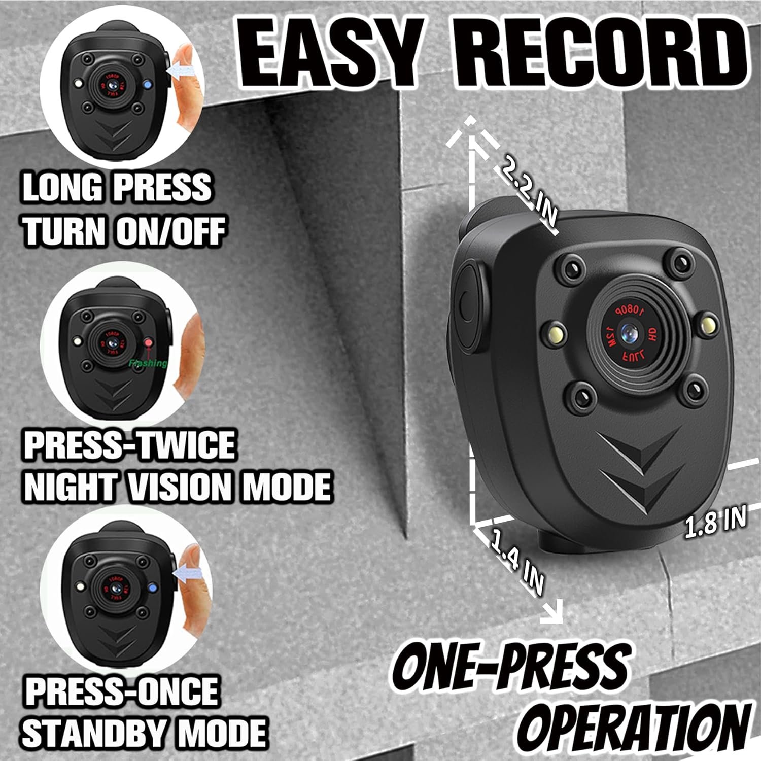 [Mini Outdoor Camera is Enhanced with Night Vision] This small camera is suitable for the outdoor. Wear it to do some outdoor sports, such as running, and bike riding, allowing you to record in the complete darkness. Incredible HD 1080P video recording at 30fps, bring you clear and fluent videos. This personal body cam features a 90-degree lens, so you can also get a broad field of view. Equipped with 4 high-intensity infrared LEDs, the distance of night vision is up to 15 feet.