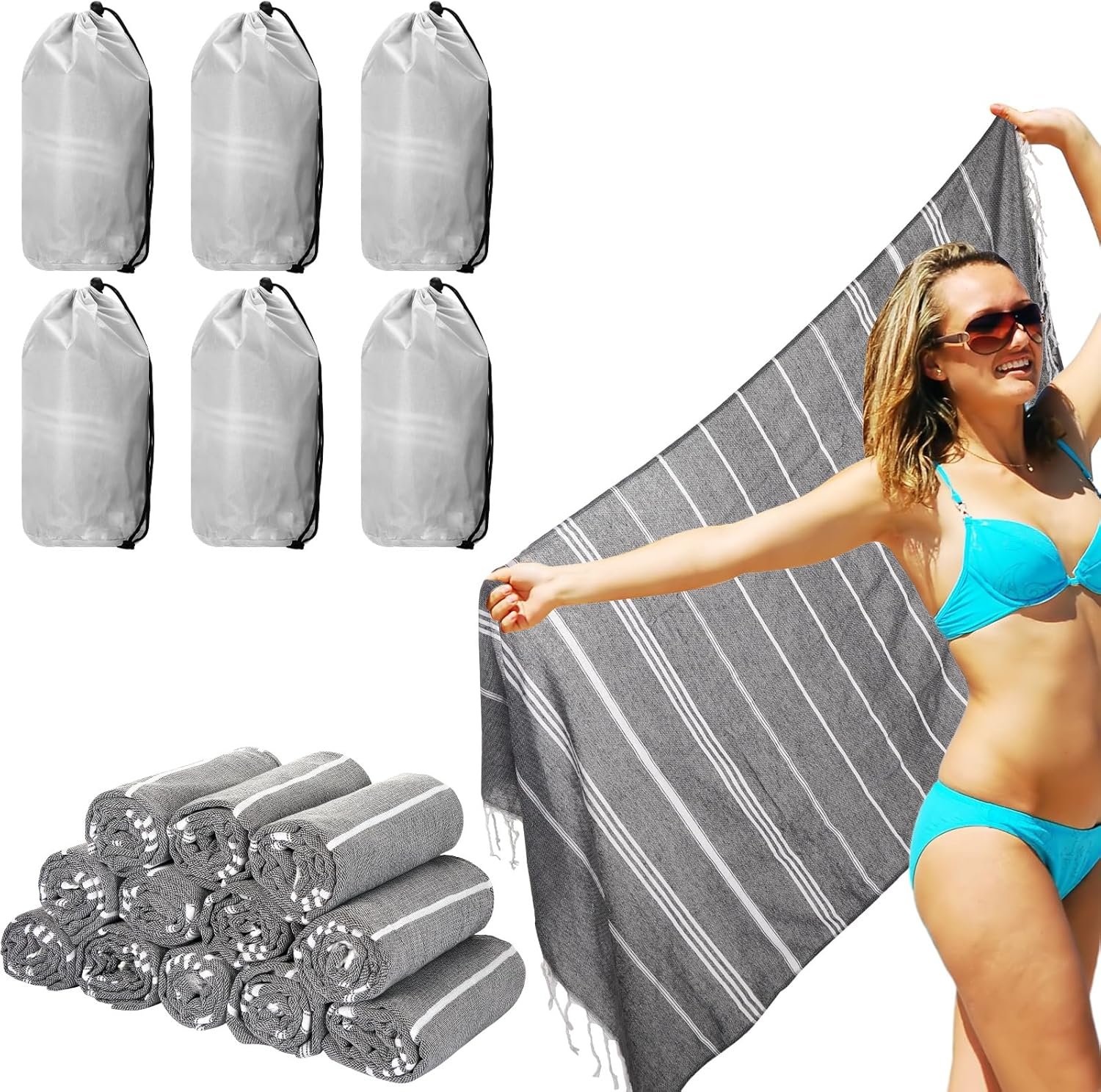 Mixweer Turkish Beach Towel with Travel Bag Bulk 39″ x 71″ Oversized Soft Cotton Beach Towel Sand Free Quick Dry Lightweight Travel Accessories Essential (Black Gray,12 Sets)