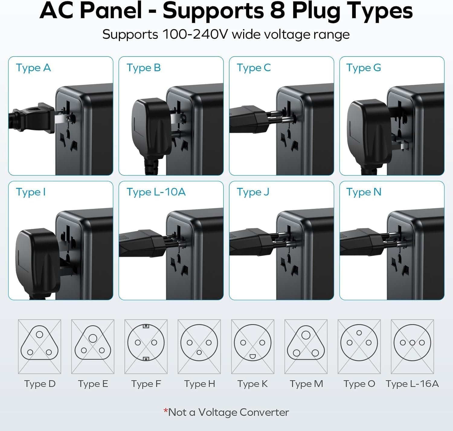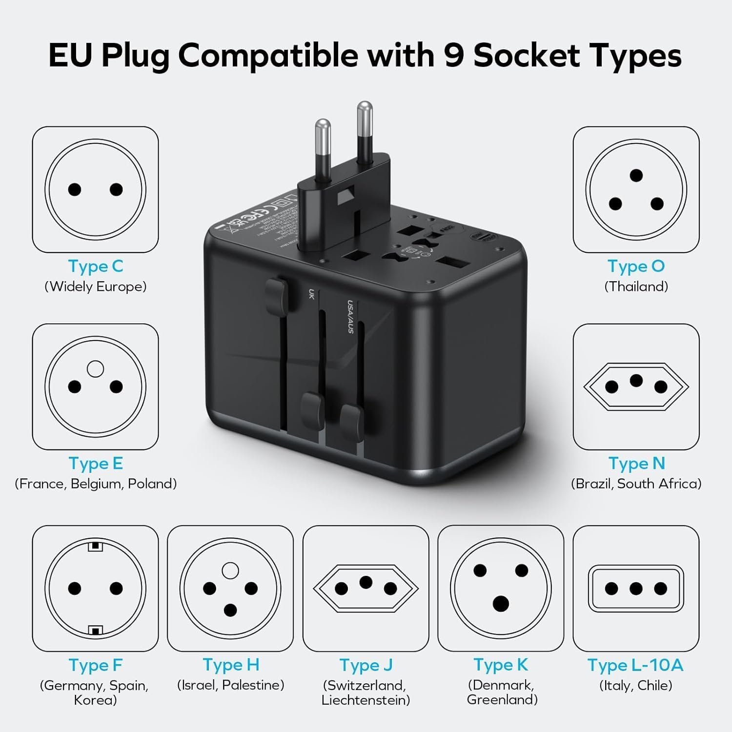5 + 1 Fast Charging: This international adapter is equipped with 3 USB-C ports, 2 USB-A ports and 1 AC outlet (Max 1100W at 110V & 2500W at 250V) and supports PD3.0 & QC3.0 fast charging. One of the USB-C PD ports can even reach an incredible high speed of 70W. It is ideal for your USB devices, especially laptop, smartphone, tablet, power bank, camera, etc.