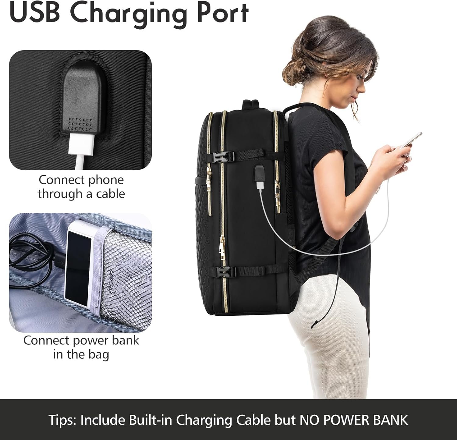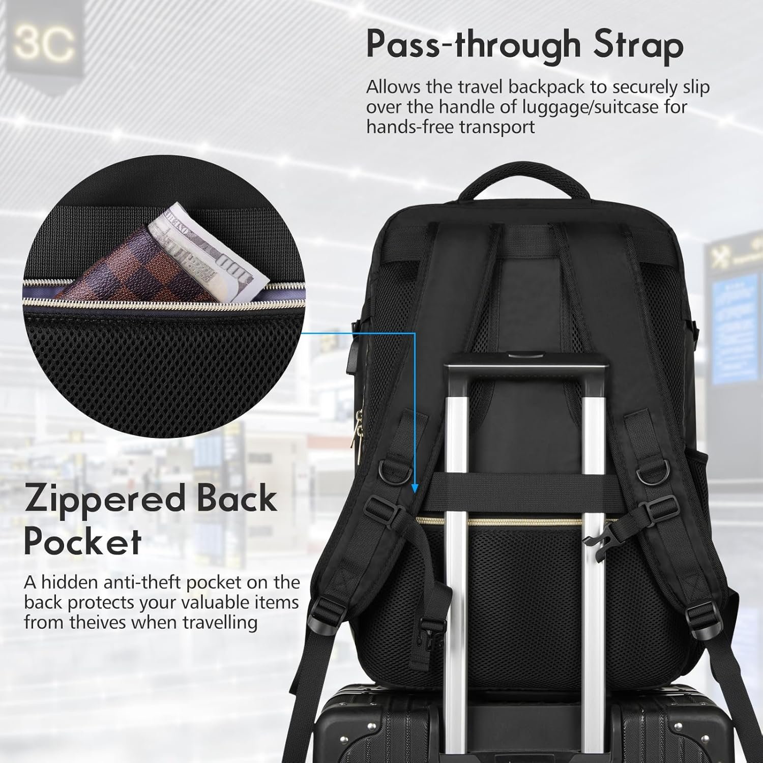 【USB Port Design,Anti-theft Pocket&Luggage Strap】:USB interface with built-in cable design, great convenience for charging your electronic devices via connecting your own power bank. Comfortable breathable back design gives you maximum back support; A luggage strap allows the travel backpack to securely slip over the handle of any rolling luggage for hands-free transport, easier carrying. A hidden anti theft pocket on the back protect your valuable items from thieves.
