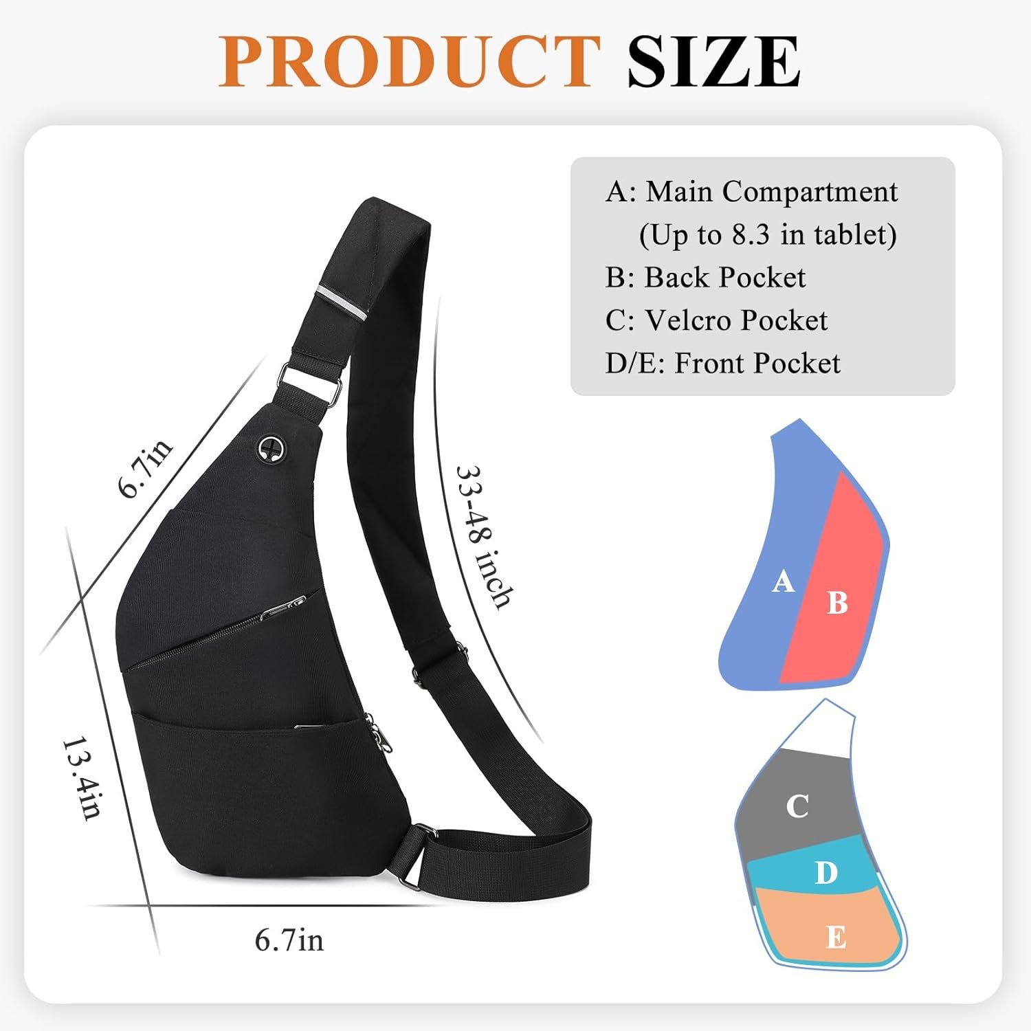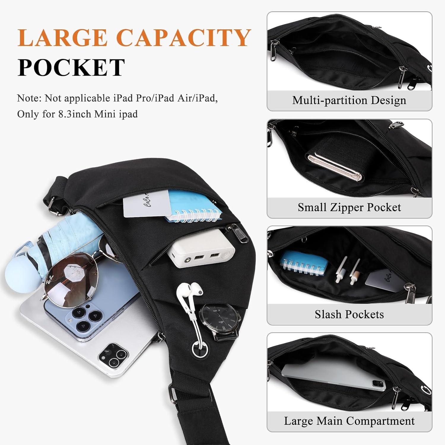 Multiple Storage Sling Bag: 1*main zipper pocket (fits up to 8.3 inch iPad mini), 1* velcro phone pocket, 2* front zipper pockets, 1*inner zipper pocket(safeguards your credit cards, ID card), 1*big back zipper pocket