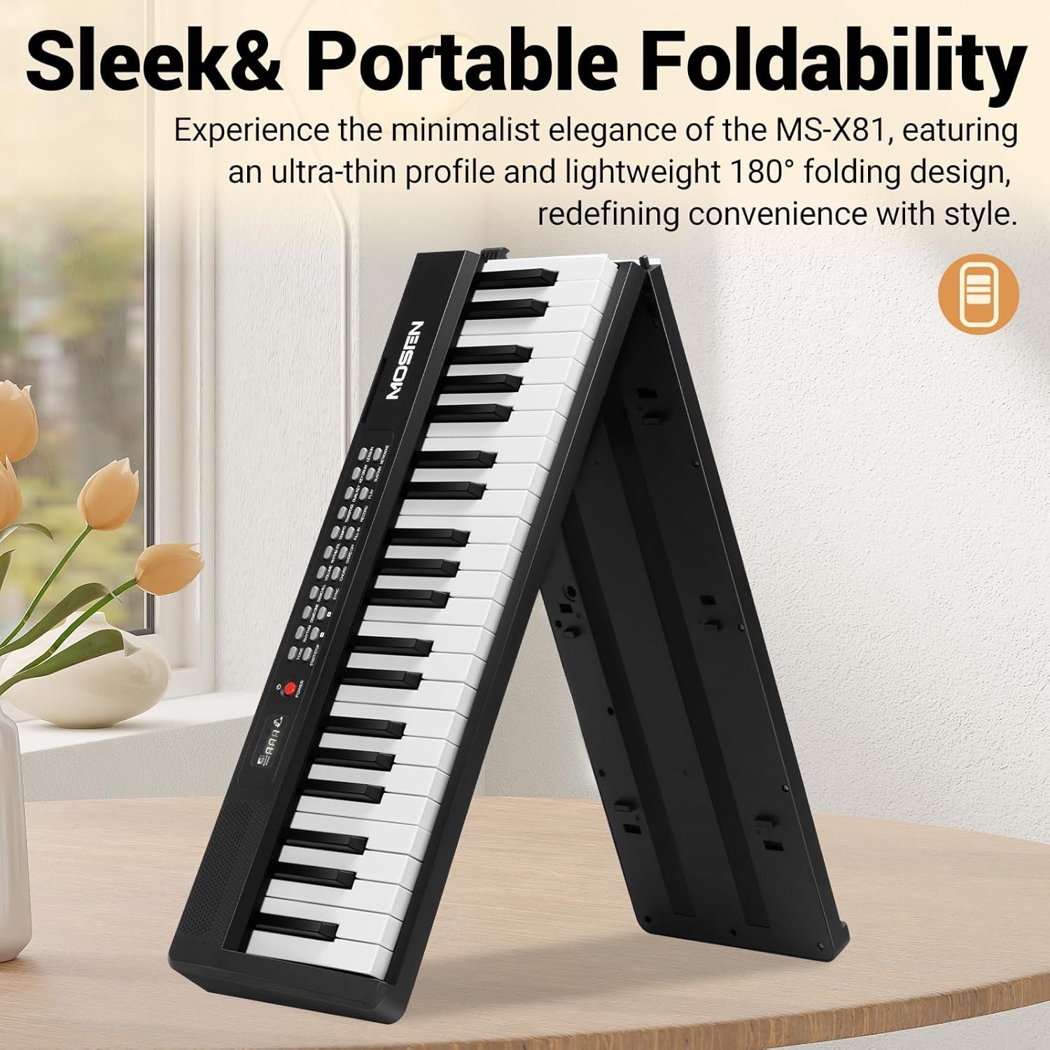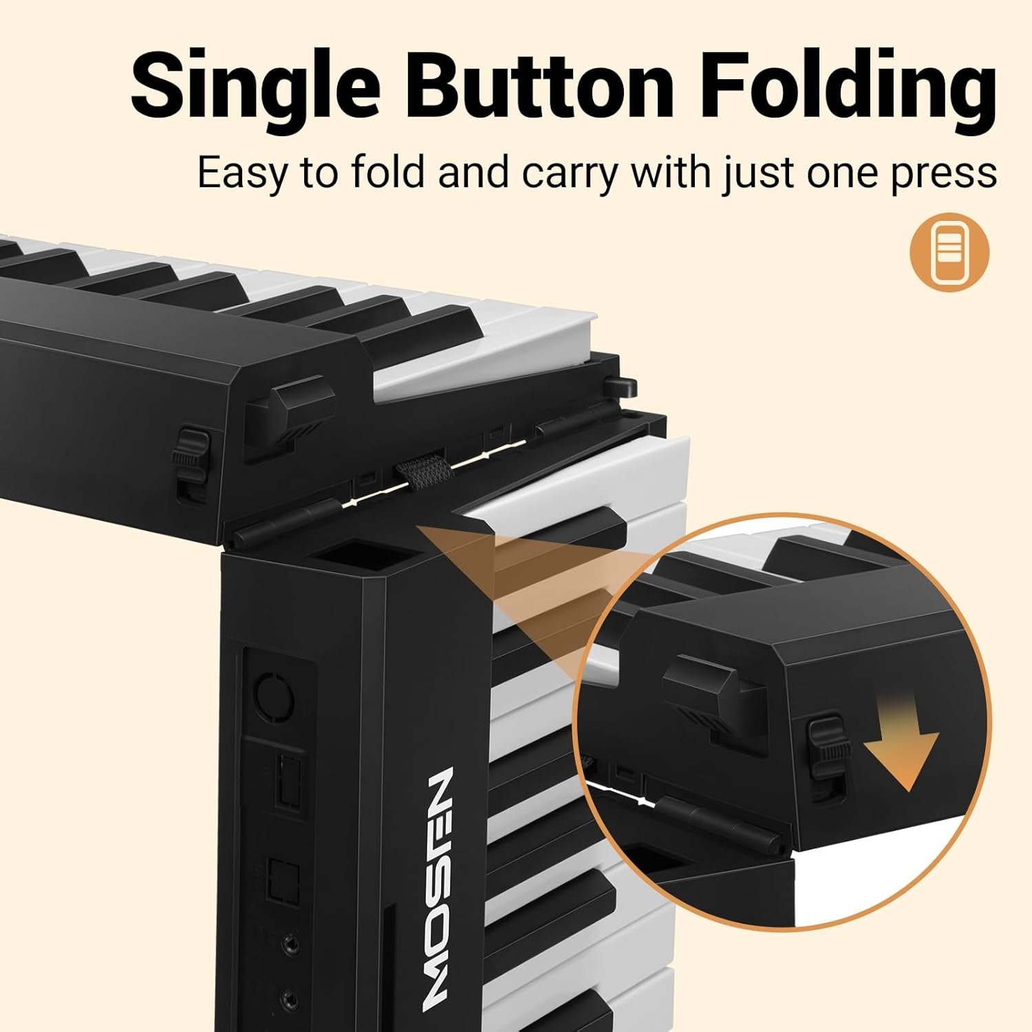 [Portable and Compact Design]: MOSEN Full-Size 88 Keys Beginner Digital Folding Piano is designed for ultimate portability, weighing just 7.8 lbs and folding to a compact 25.2″ length. Ideal for travel and storage, it fits effortlessly into any space, from luggage to small closets