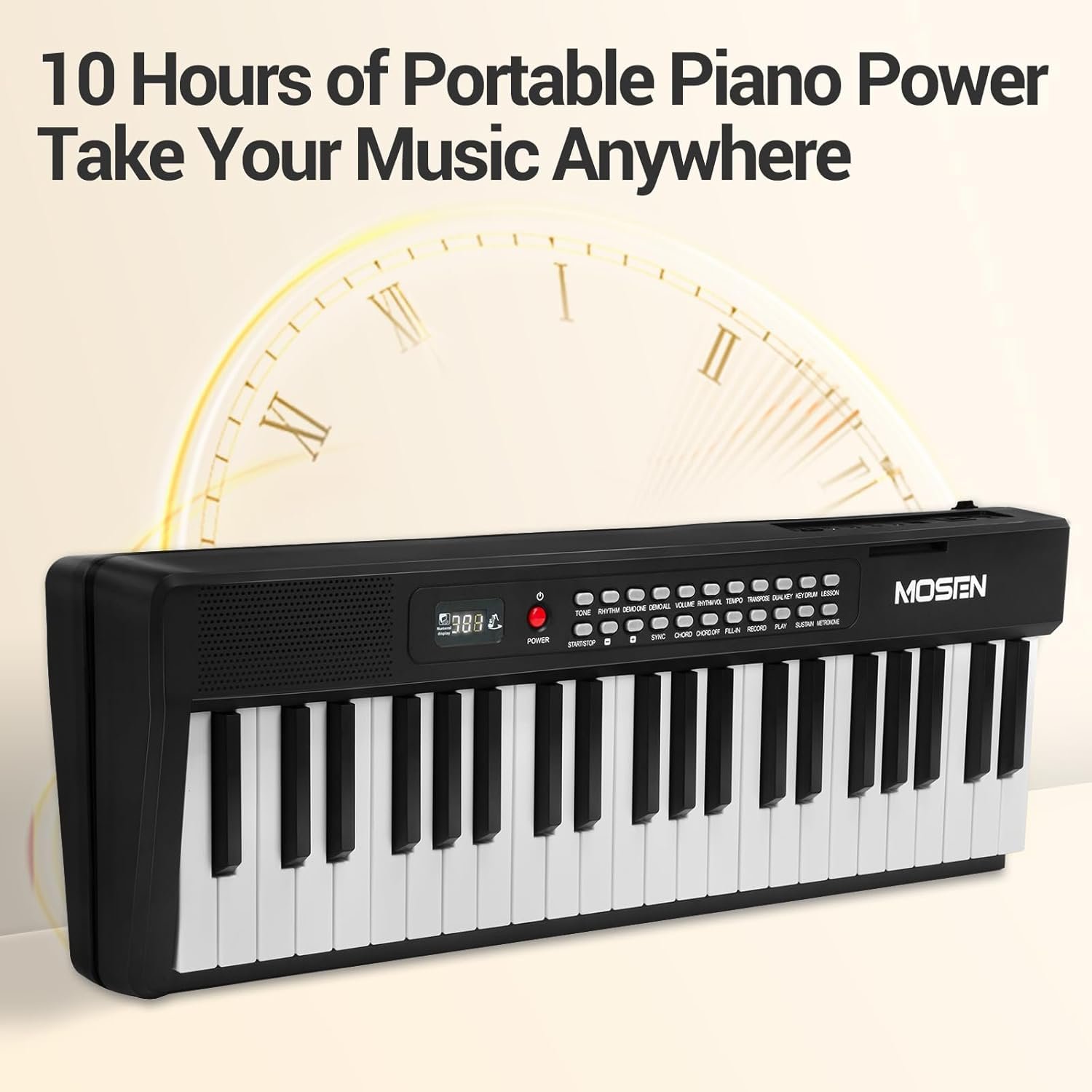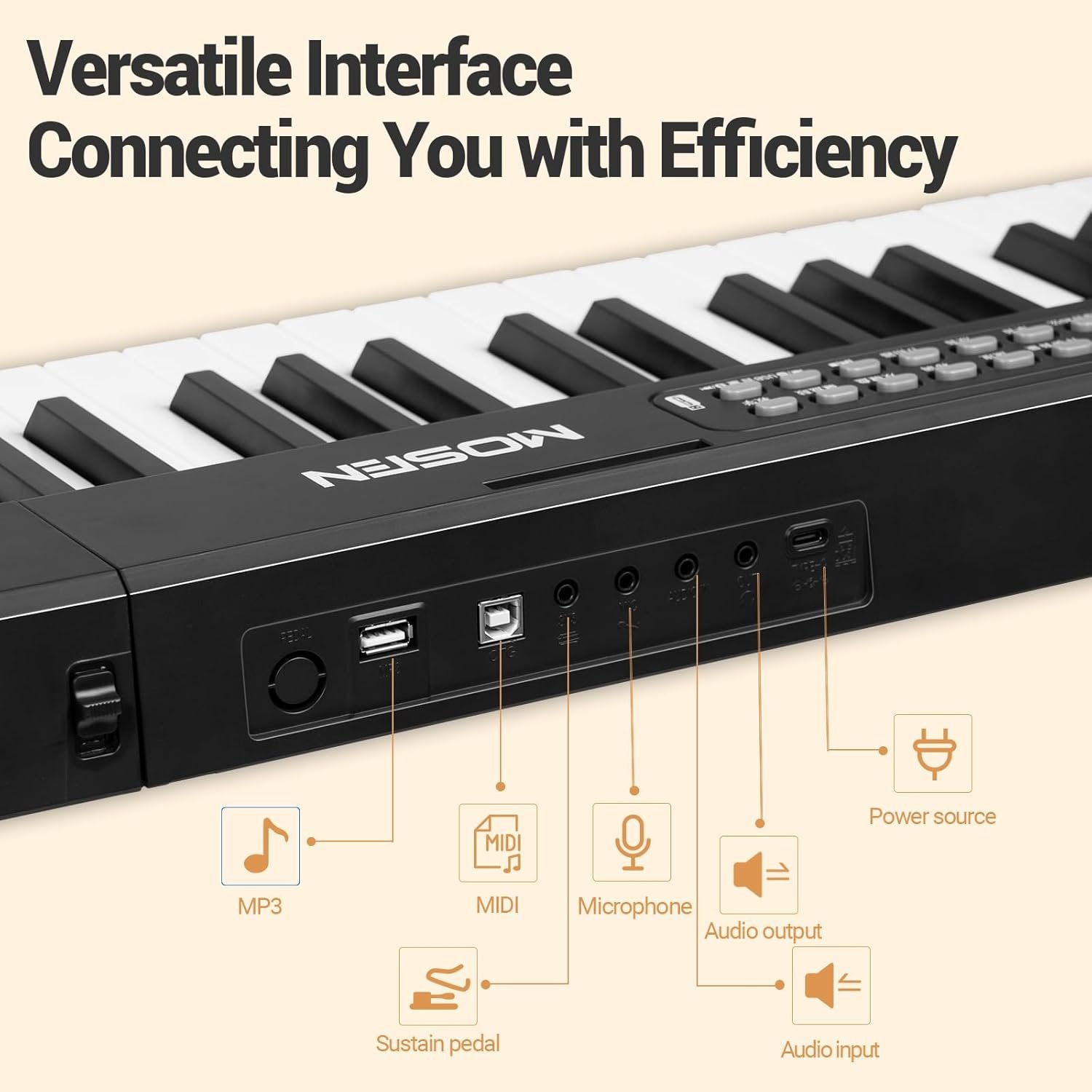 [Long-lasting Battery Lif]e: With up to 10 hours of battery life on a single charge, the MOSEN keyboard piano ensures uninterrupted playing sessions, whether you’re at home, outdoors, or on stage