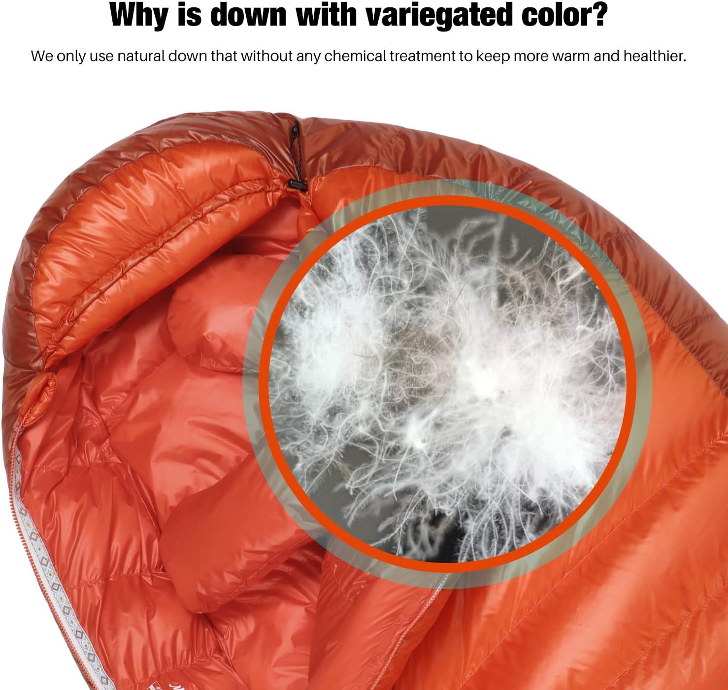 EXTRA SPACE FOOT AREA- This down sleeping bag can provides you extra space to keep your feet stretched.