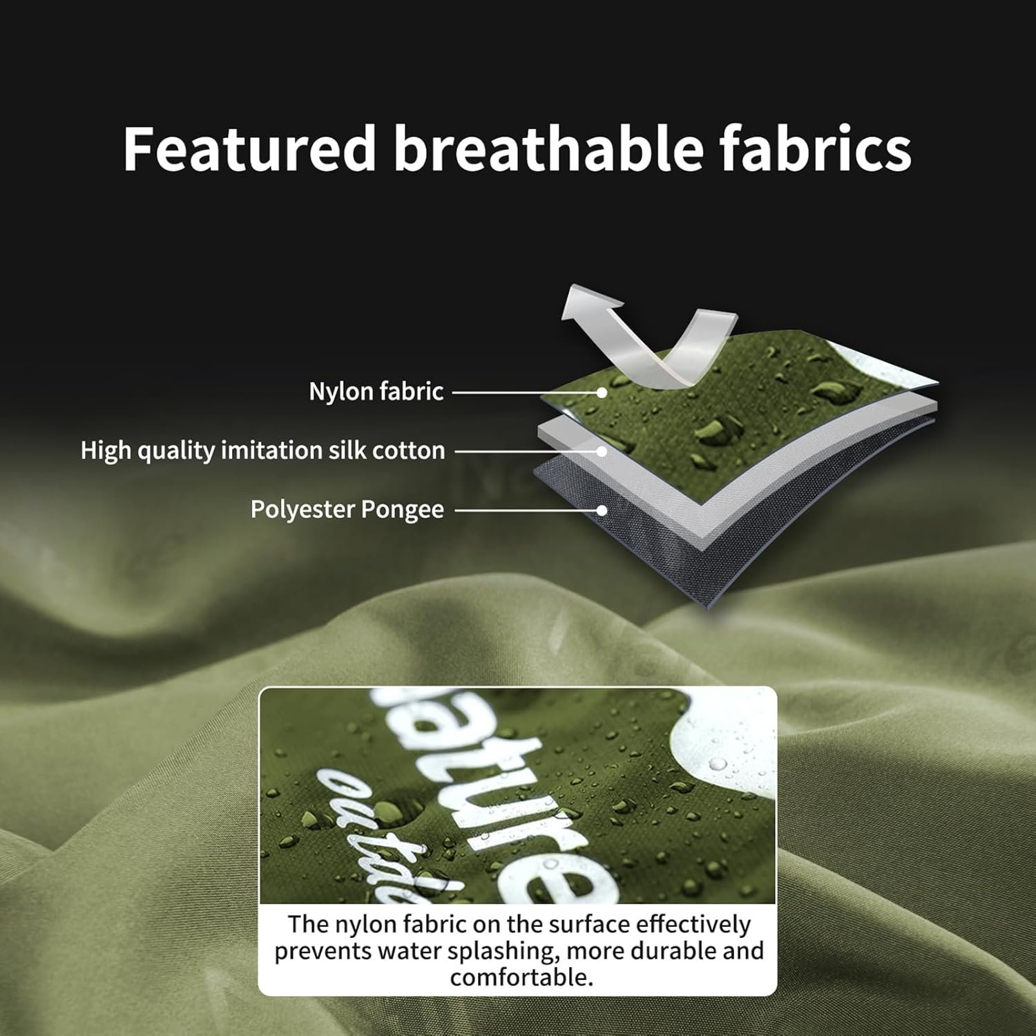 Material: Outer Cover Material:20D 380T Nylon, Waterproof and Breathable Fabrics; Lining Material: 240T Polyester Pongee; Fill-Material: 100% premium Silk-like cotton.Product Size:M:74.8″L x29.5″W XL:80.7″L x33.46″WWeight: M:1.5lbs XL:1.68lbsPackage Dimensions:M:4.72”x11.42” XL:5.1”x12.2”