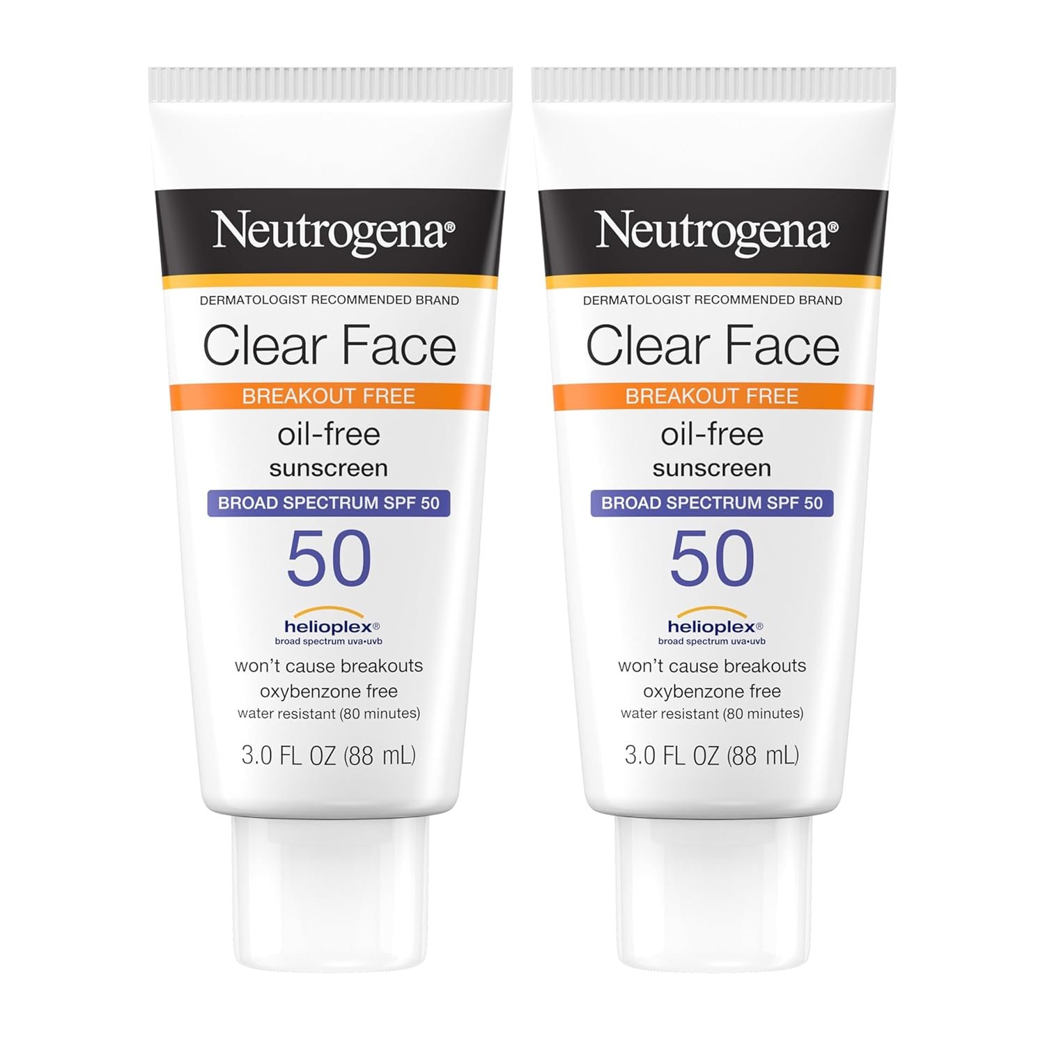 Pack of two, 3 fl oz Neutrogena Clear Face Sunscreen for Acne-Prone Skin Stabilized with Helioplex technology, this oxybenzone-free facial sunscreen offers superior Broad Spectrum SPF 50 UVA/UVB protection