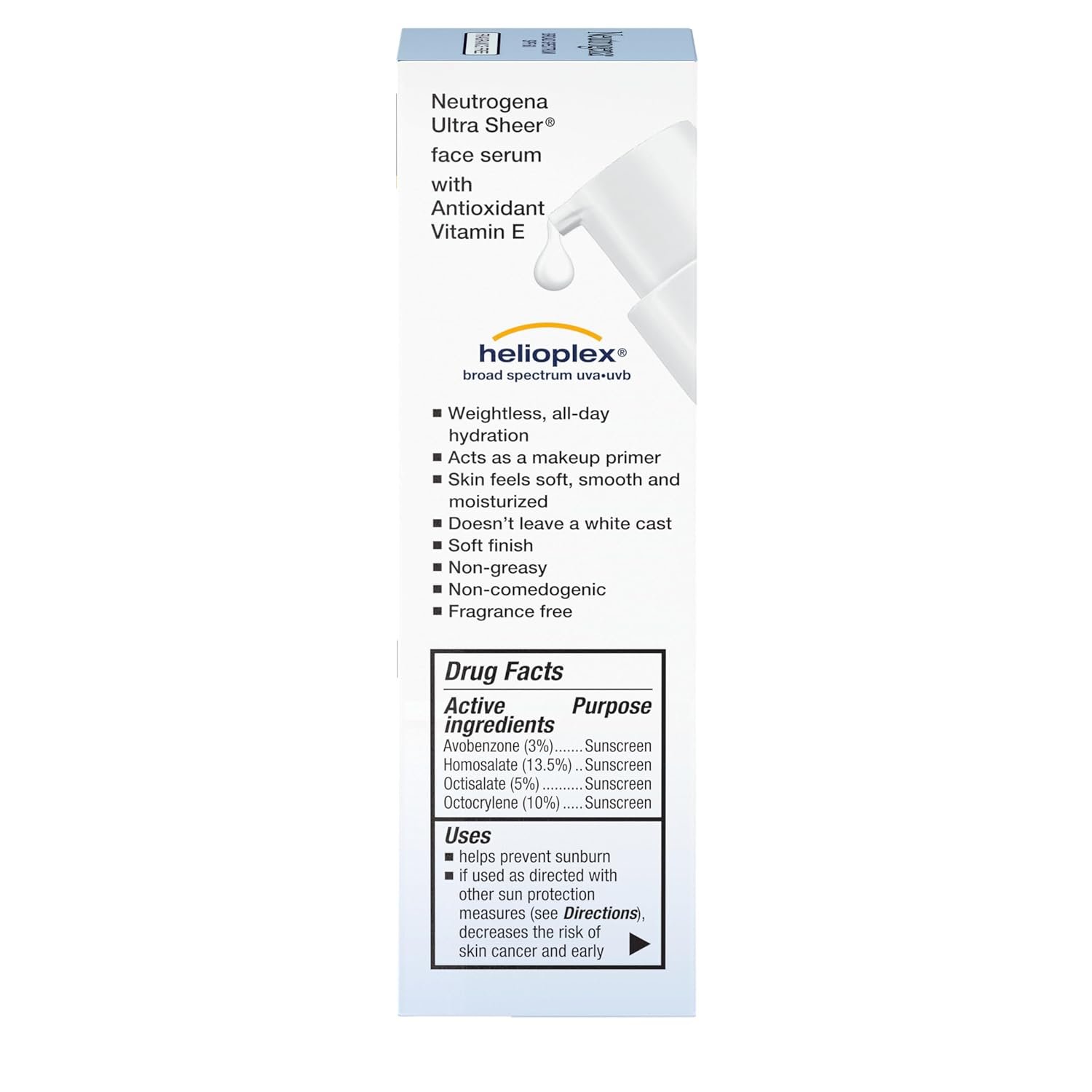 Package Includes One, 1.7 ounce bottle. Enjoy a full day in the sun with Neutrogena Ultra Sheer SPF 60 Face Serum, which offers broad-spectrum UVA and UVB protection, ensuring your skin is shielded from harmful rays