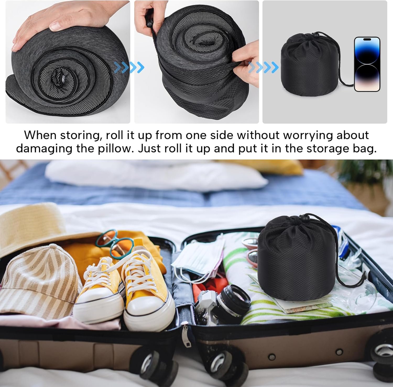 【Effortlessly Portable】:Our travel neck pillow can be easily rolled up and put into a bag for easy carrying. Our neck pillow has a layer of anti-sticking cloth to prevent other things from sticking to it when not in use. You can stick it firmly after tearing it off.