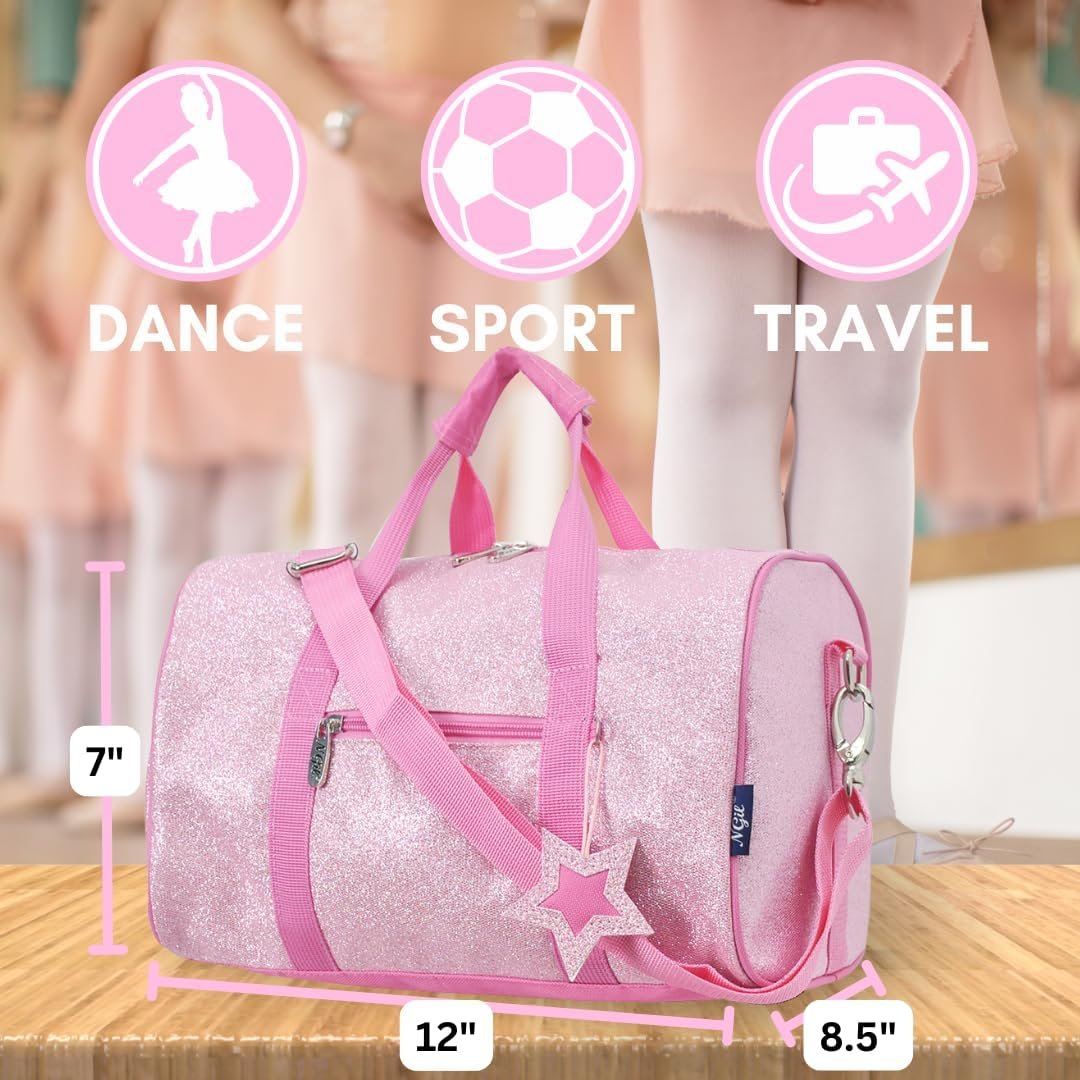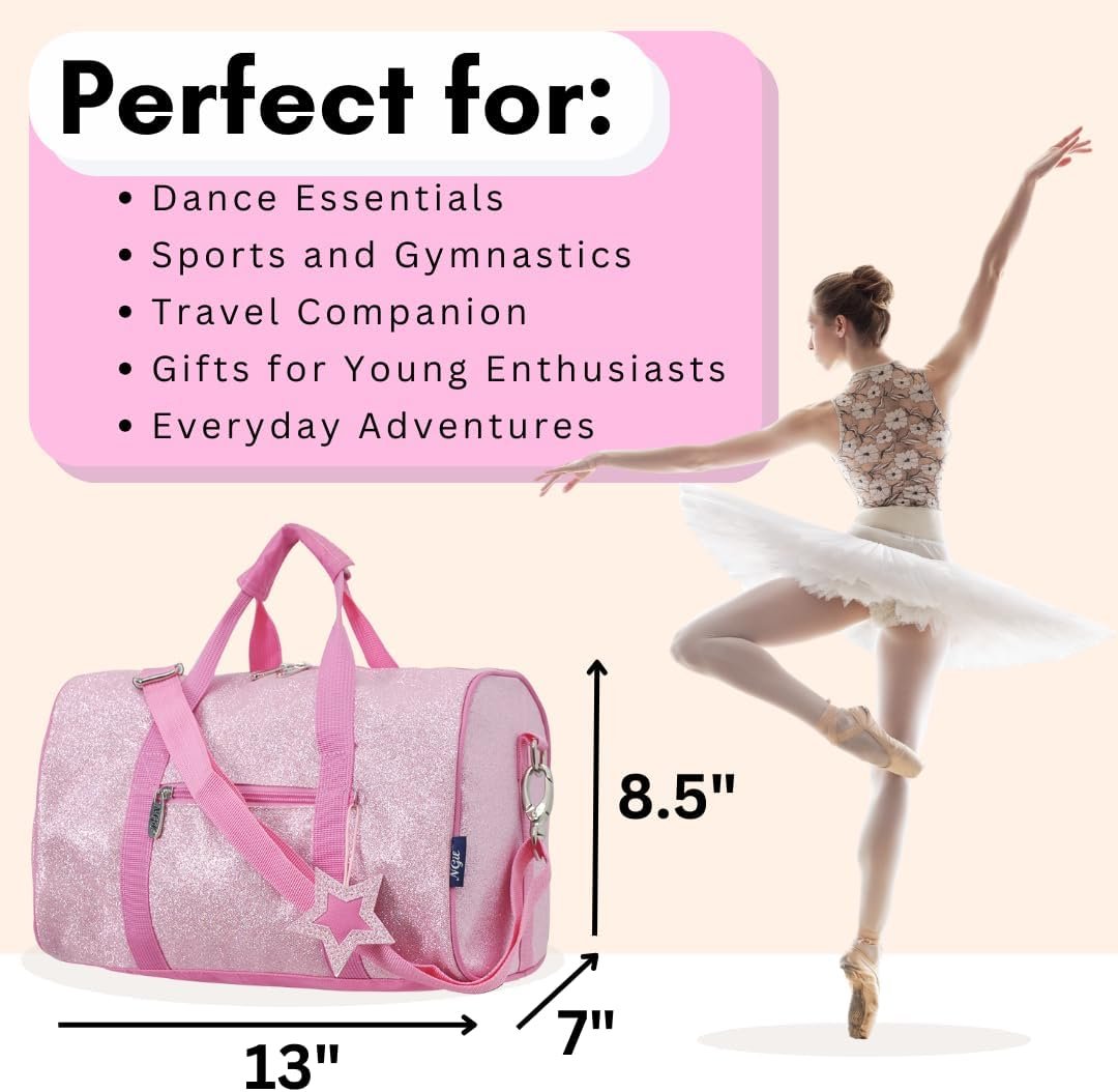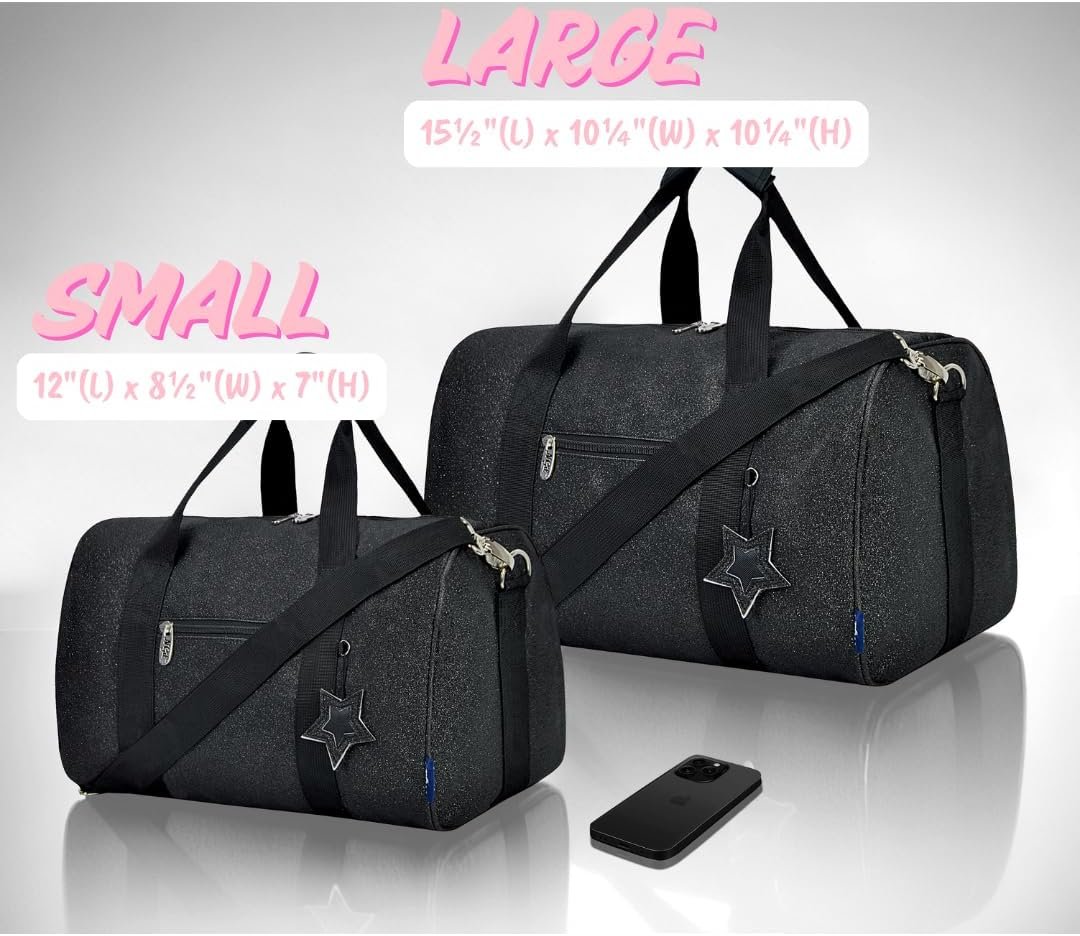 Stylish and Compact Design: The NGIL Super Star Duffle Bag is a mini glitter duffle bag designed for dancers and active lifestyles, featuring a stylish glittery design and a compact size of 12” x 8.5” x 7”.