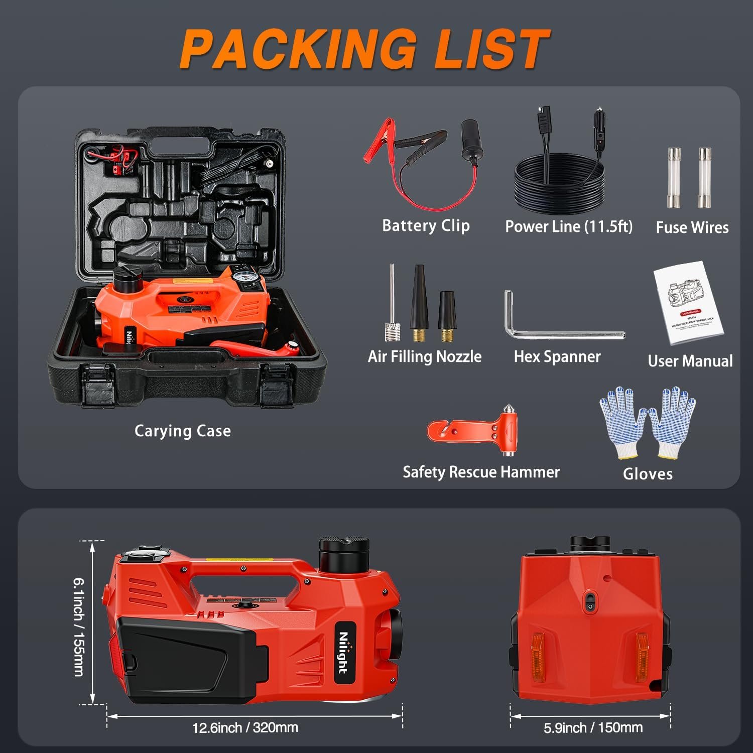 PORTABLE JACK SET INCLUDE- Multifunctional Electric Jack x 1, safety hammer x 1, Inflating Needle x 1, American-Type Inflatable Head x 1, British-Type Inflatable Head x 1, Fuse For Cigarette Lighter x 1, Six-Angel Spanner x 1, Gloves x 1, Instruction Manual x 1. The included storage box neatly organizes the electric car jack and accessories, very space saving and easy carrying