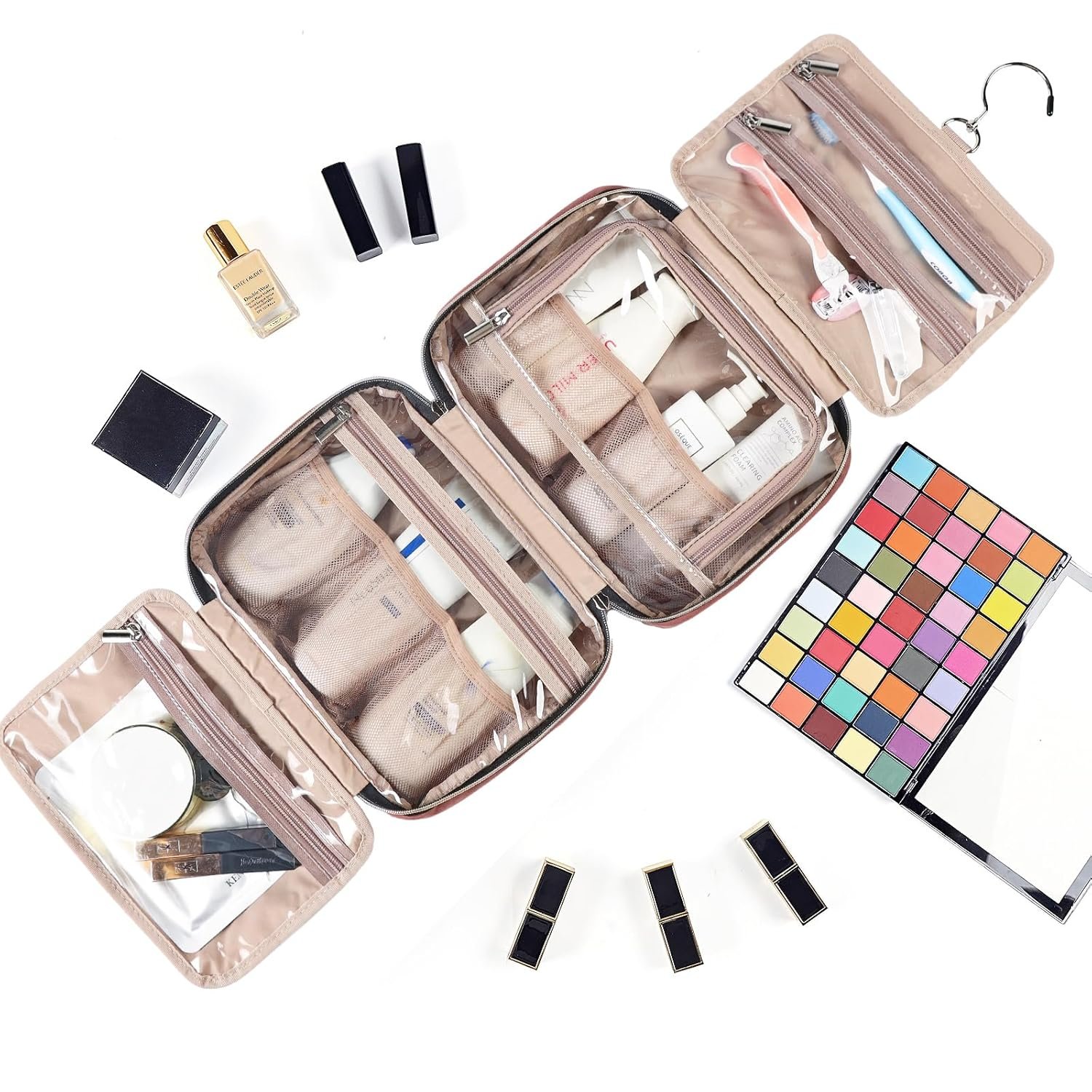 NISHEL Travel Toiletry Bag for women, Portable Hanging Organizer for Travel-Sized Shampoo, Conditioner, Brushes Set, Makeup Accessories, Medium Size, Rosewood-Pink