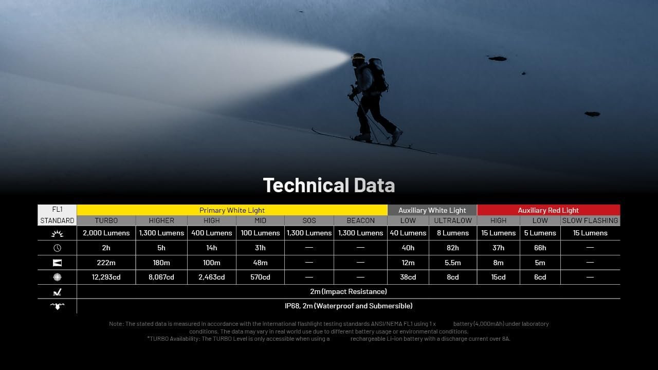 POWERFUL HEADLAMP- The HC65 UHE headlamp is capable of emitting 2000 lumens with a max beam distance of 243 yards.