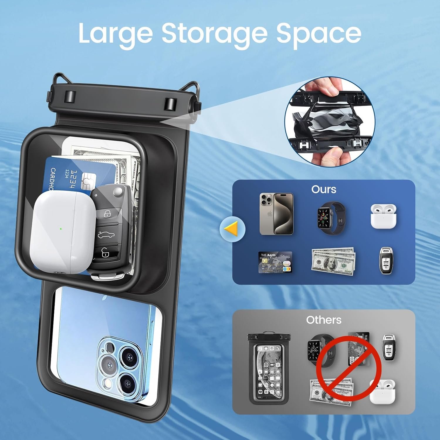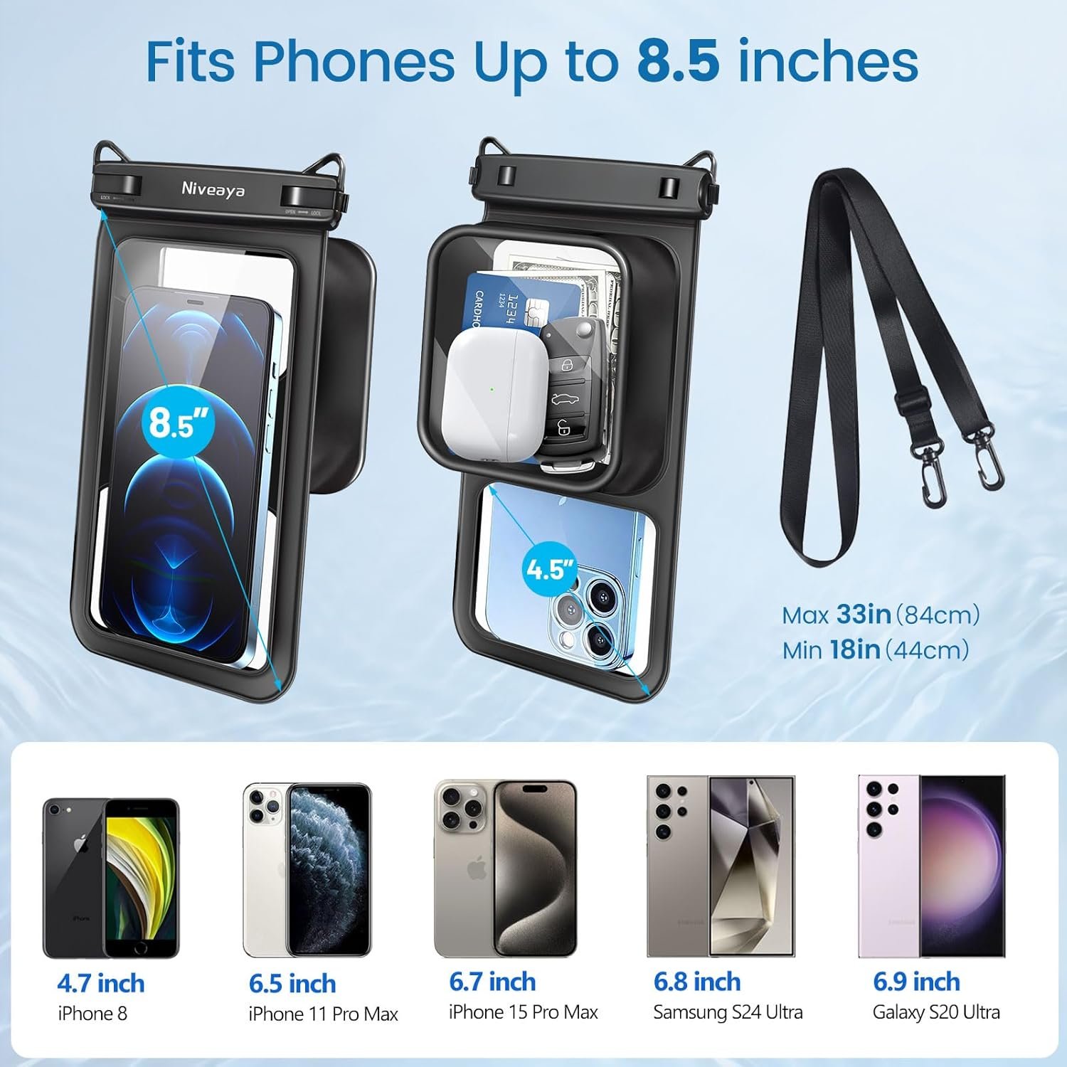 【Fits Most Cell Phones】- The water proof phone pouch iphone measures 8.5 inches and fits most cell phones with or without a case, providing double insurance for your phone. Fits large devices up to 7.5 inches, such as iPhone 16 15 14 13 12 11 XS XR X Pro Max Plus Mini, S24 S23 S22 Ultra and more.