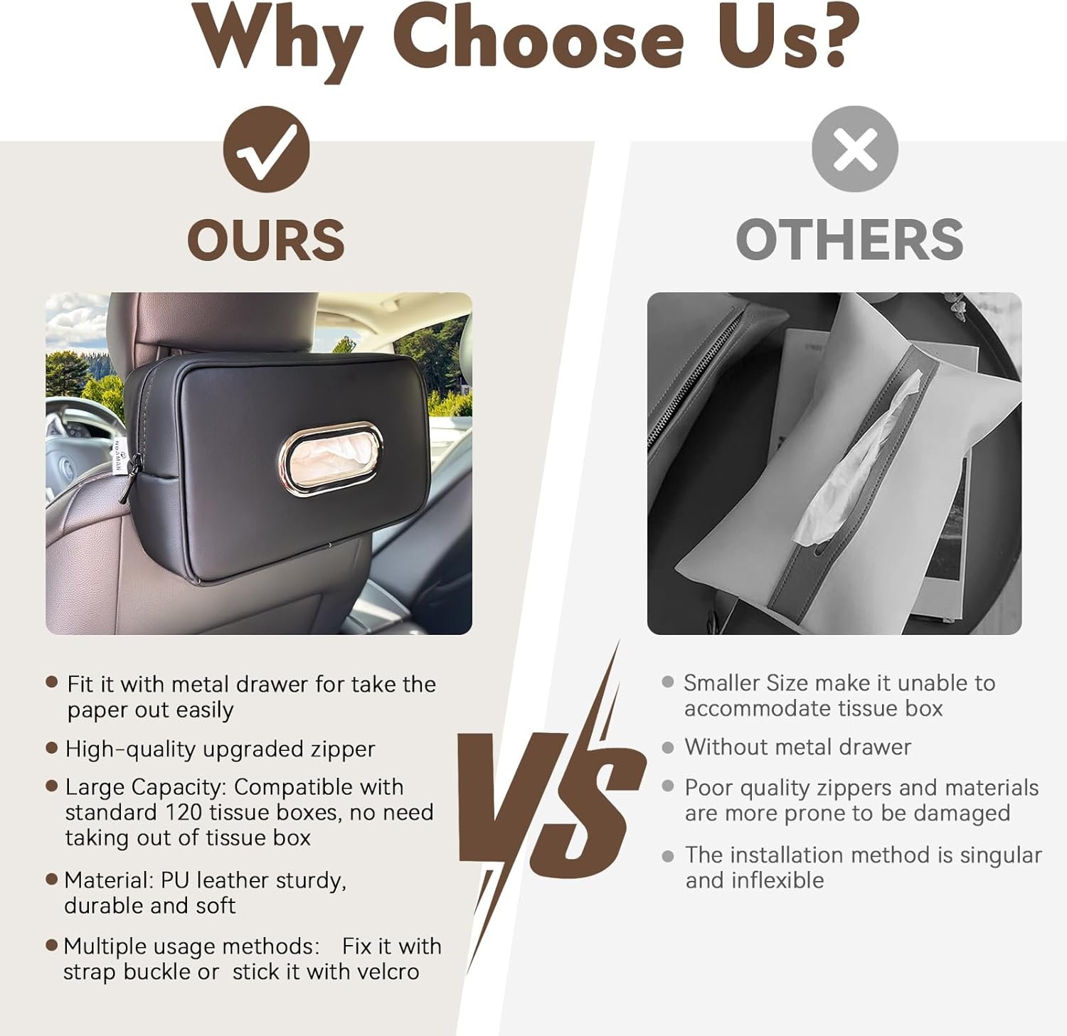 【Three layer material &Velcro Design】The kleenex holder for car backseat , a premium choice crafted with a three-layer material design for added durability and comfort. The exterior is wrapped in high-quality PU leather, while the intermediate boasts a sponge layer for cushioning and internal lining ensuring a luxurious feel and protection for your tissues, The napkin holder for car is secured in place with a reliable Velcro, allowing for easy attachment and ensuring that it stays firmly in place without shifting or shaking during travel. This thoughtful design keeps your tissues within reach and your car’s interior looking sleek and organized.
