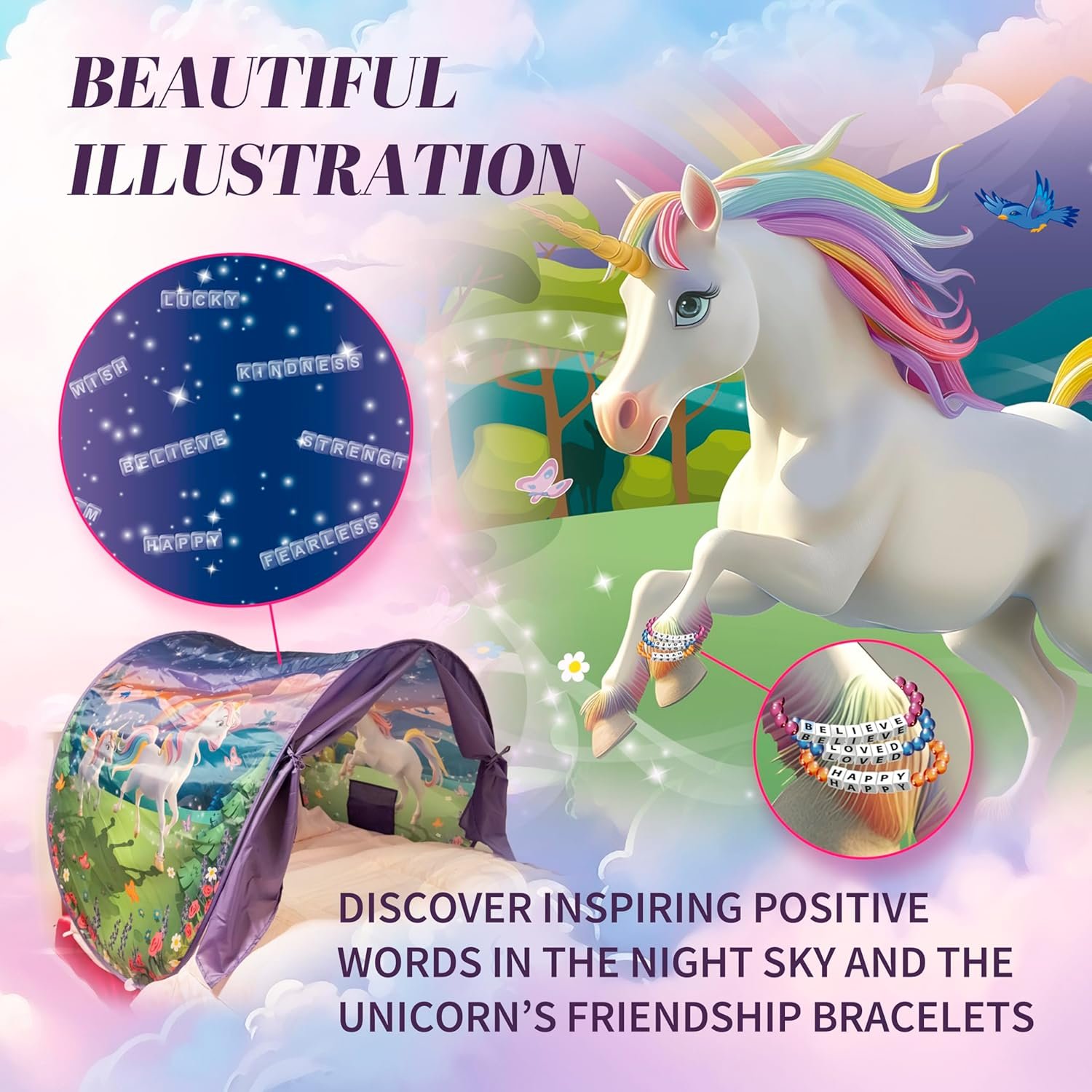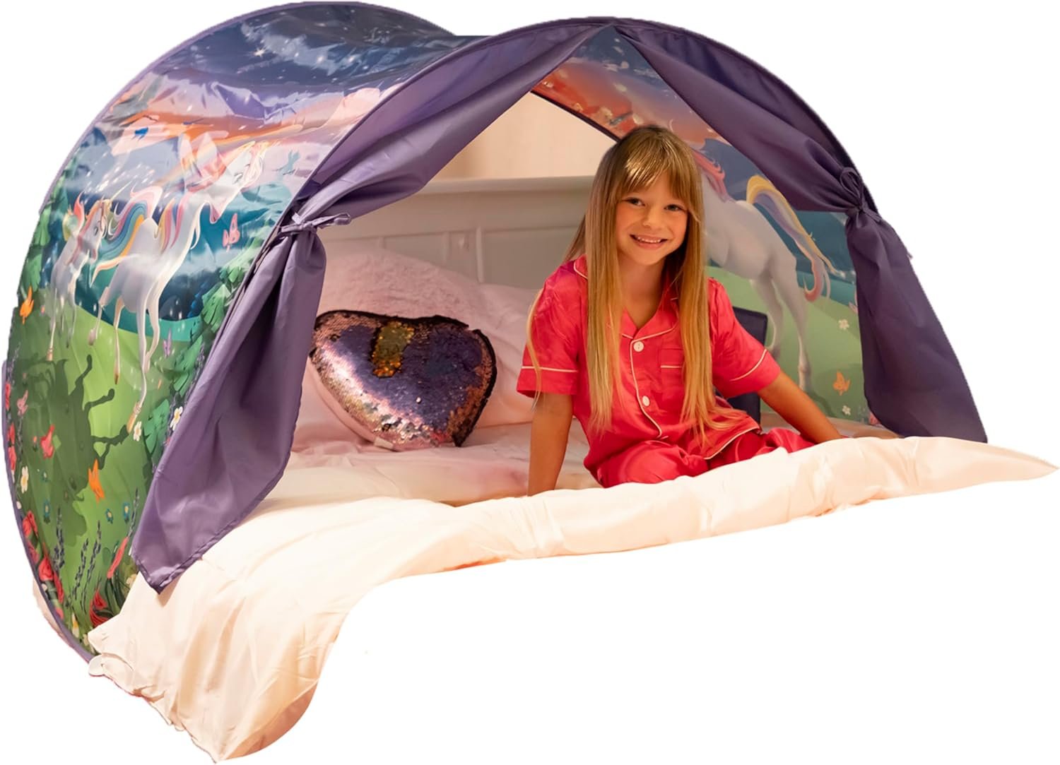 Unicorn Dream Tent: Transform your child’s bed into a magical unicorn-themed fantasy where dreams, kindness, and joy thrive with an innovative kids bed tent; this toddler tent bed creates a safe space to inspire imaginative play and nighttime comfort