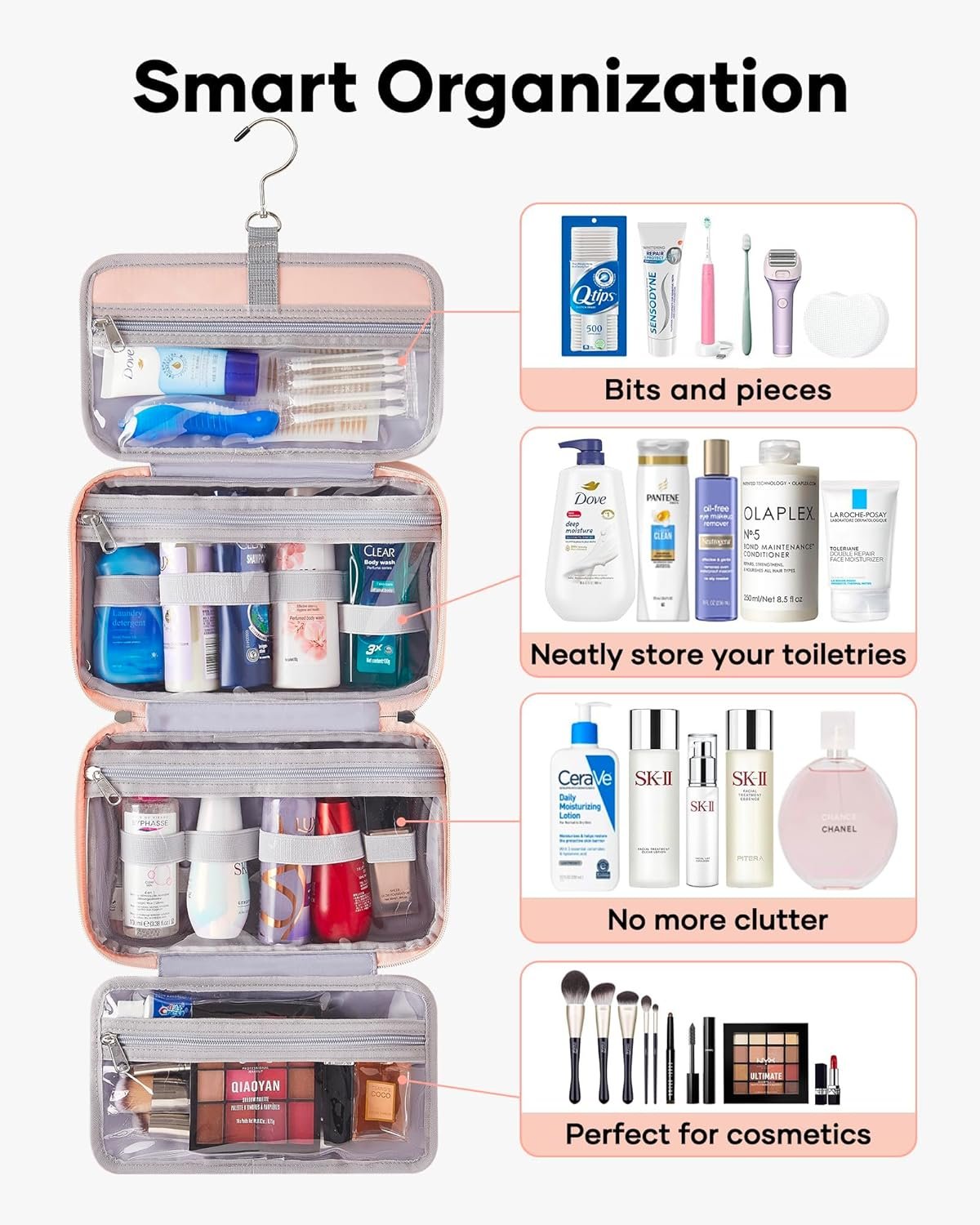 Hanging Hook & See-Through Panel : Convenient and mess-free! The 360° rotating, non-slip metal hook lets you hang this bag on bathroom doors, towel racks, or closet rods, keeping your toiletries within reach. The clear panel provides instant visibility, so you can quickly grab what you need without rummaging through your bag. Plus, the upright design prevents leaks, and when you’re done, it folds flat for compact storage.