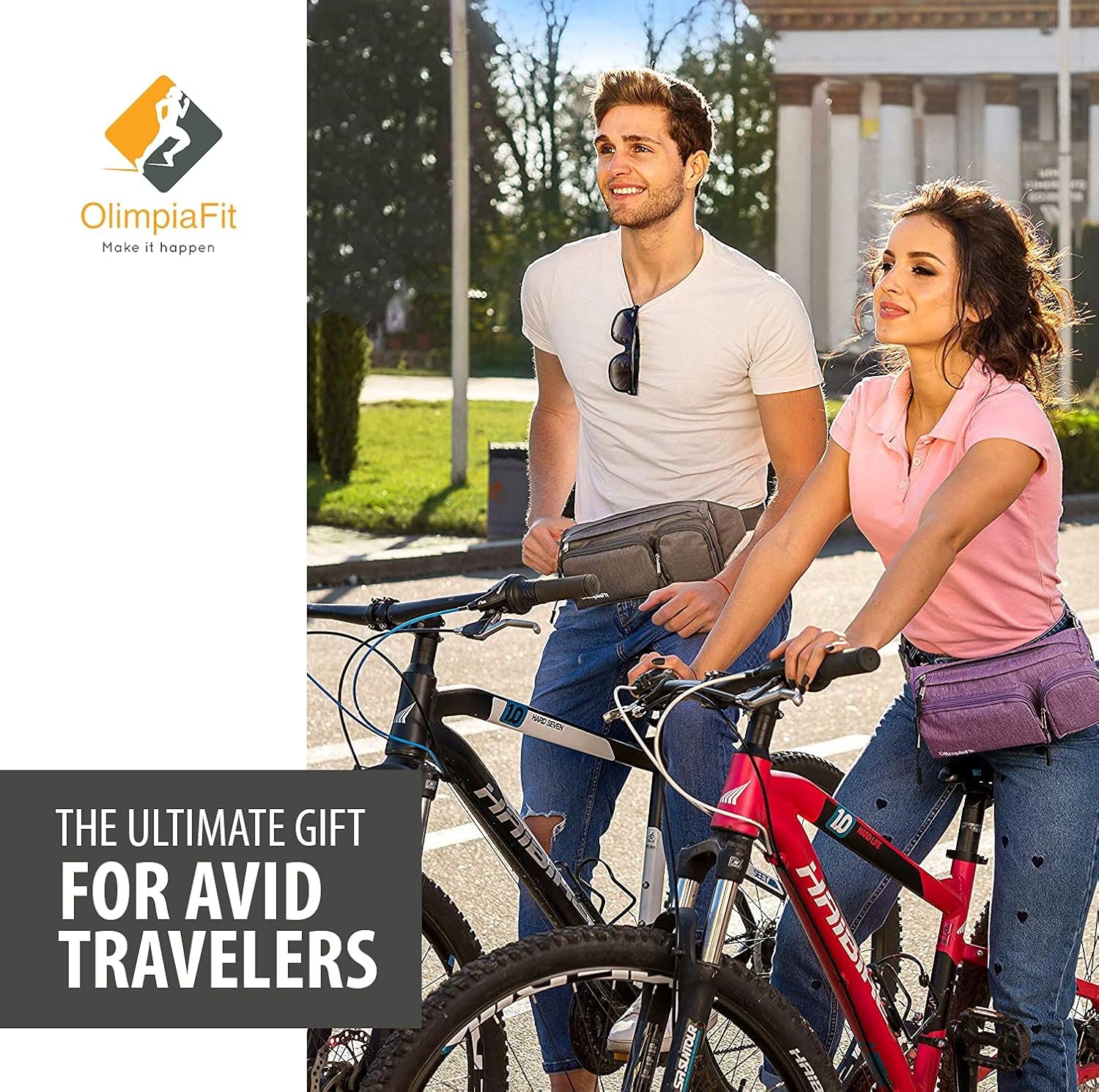 PERFECT ON THE GO ACCESSORY: Ultra-lightweight comfortable waist pack will keep your hands & pockets free! OlimpiaFit fanny bag fits everything you need inside & organized. Ideal anti-theft waist bag with hidden pockets. Keep your essentials at arms length and valuables safe when travelling, shopping, at theme parks, fairs, festivals, concerts. Great for running chores, dog walking, camping and all workouts (cycling, jogging, hiking). Simple fashionable design looks stylish with any outfit.