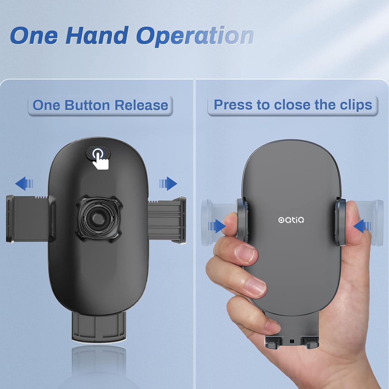 Quick One-Button Release: Effortlessly mount and remove your phone with the one-button release system. Simply press the release button on the back of the cradle, and the clamp arms will smoothly slide open.