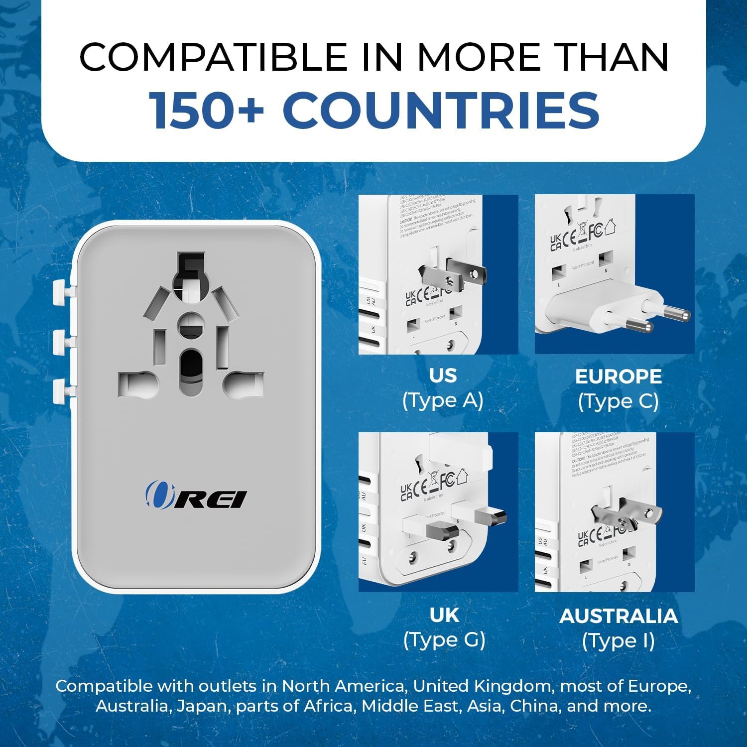 Global Plug Compatibility: Features Type A (USA, Canada), Type I (Australia, China), Type C (Europe, South America), and Type G (UK, Ireland). The OREI universal travel adapter USB C is versatile for worldwide use.
