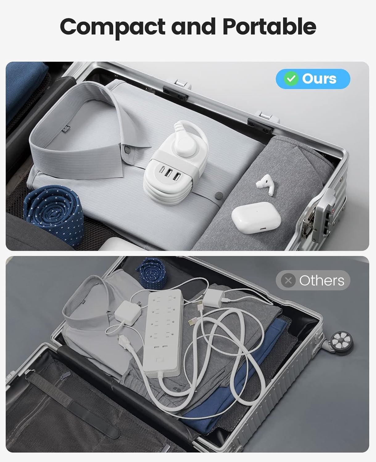 【Portable Power Strip】Our mini power strip measures 4.0*2.4*1.6″, equivalent in size to a credit card. It combines multiple plug outlets into a tiny yet versatile usb power strip, allowing you to travel light