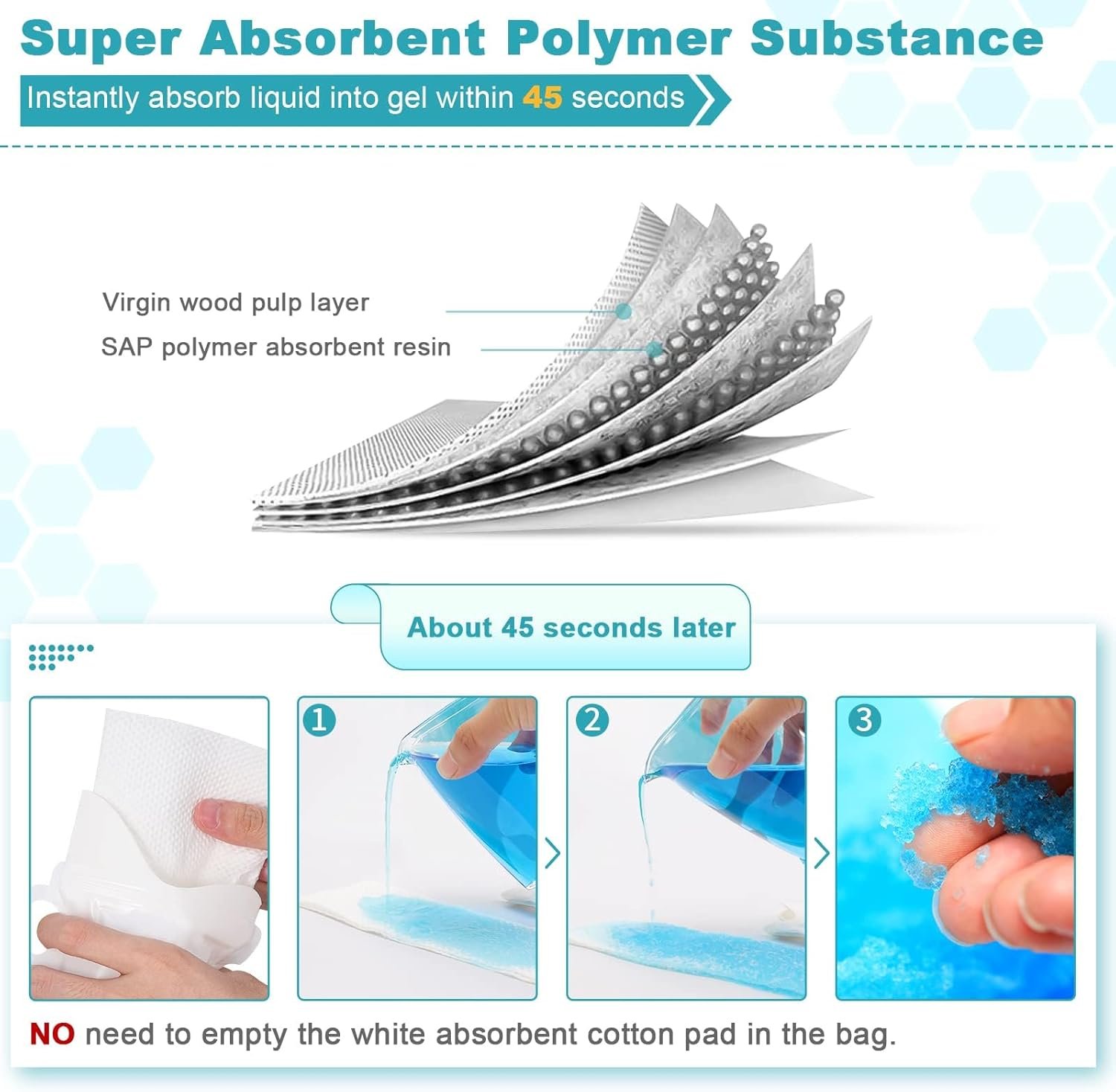 Instantly Absorb Liquid within 45 Seconds: Our disposal urine bag is equipped with SAP water-absorbing polymer substance that can absorb urine, vomit, or other liquid waste and turns it into odorless, spill-proof gel. And it can instantly absorb the liquid into gel within 45 seconds