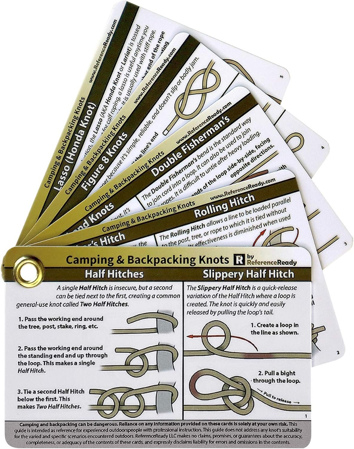 Knot cards with step-by-step, color-coded knot tying diagrams designed to be easy to follow, including descriptions and usage tips